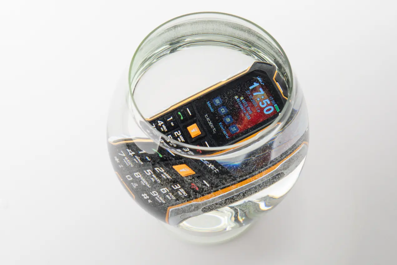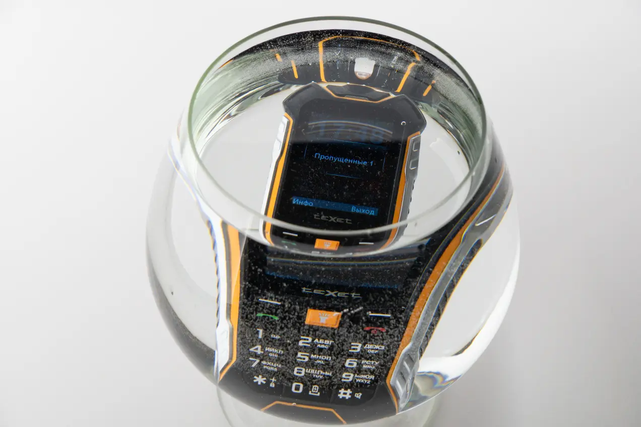 Чтобы соответствовать классу защиты IP68, телефон Texet TM-530R должен выдерживать погружение в воду на глубину более метра в течение 30 минут. Жаль, столь глубокой емкости у нас не нашлось. Но с погружением на меньшую глубину проблем не возникло. Телефон охотно принял получасовые водные процедуры. Под водой он исправно принимал вызовы, даже было что-то слышно! После получаса мы извлекли его из воды полностью исправным.