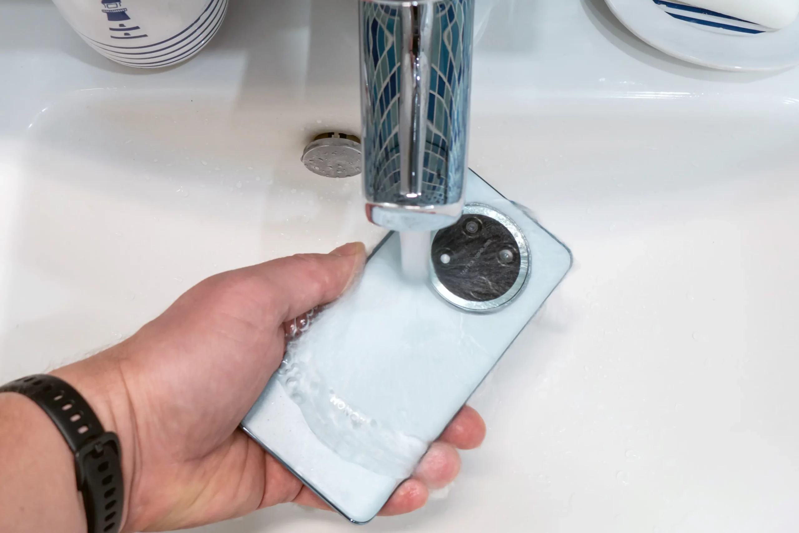Класс защиты HONOR X9c заявляется как IP65M и подразумевает защиту от струй воды со всех сторон. На официальном сайте указывается, что он протестирован в течение трех минут струей мощностью 12,5 л в минуту. Формально смартфон не водонепроницаемый, но в ходе теста я не только мыл его под краном, но даже погружал ненадолго под воду.