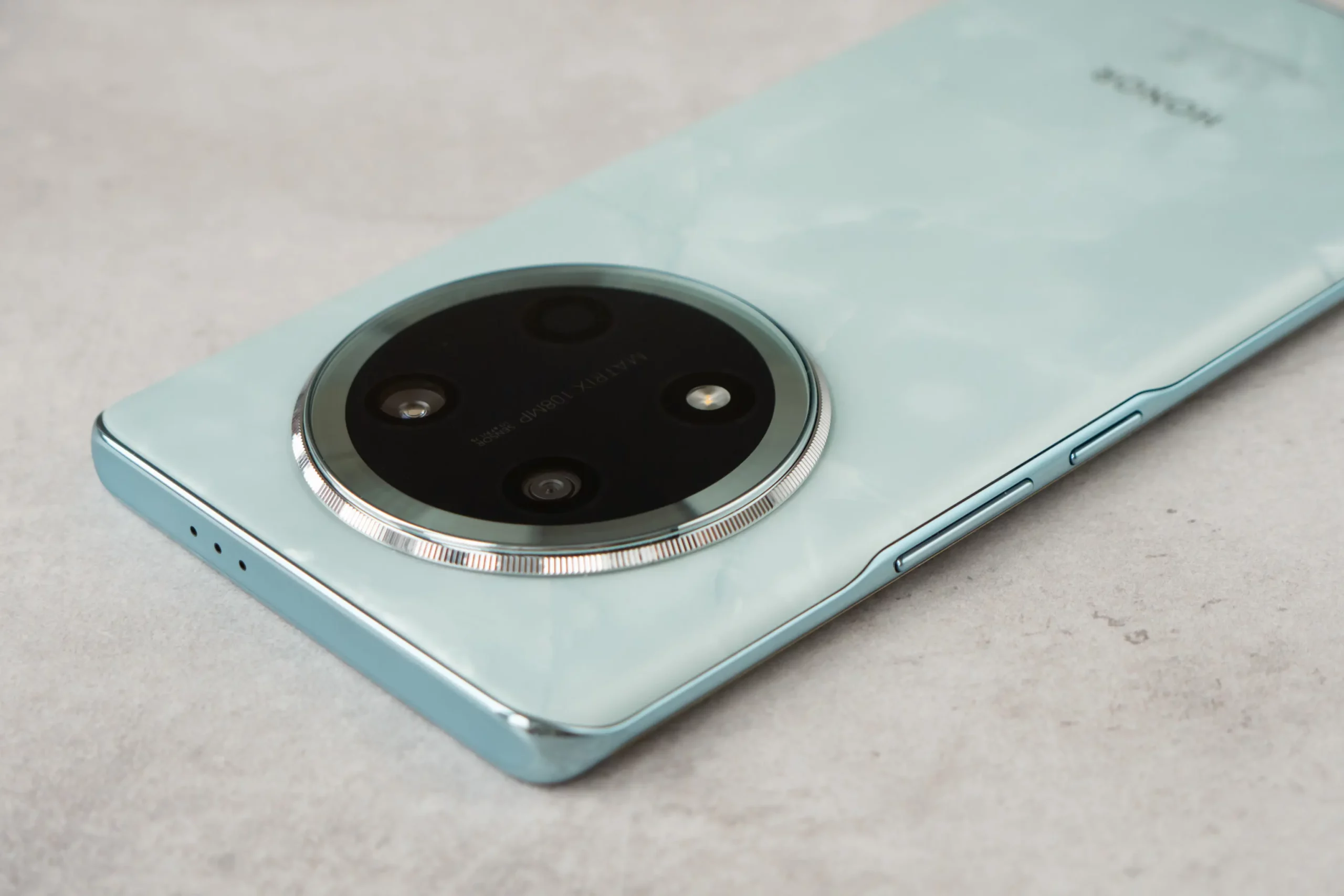 Задняя стенка матовая, а у модели в голубом цвете еще и текстурированная под перламутр. Круглый блок камер выпирает из корпуса незначительно, буквально на 2−3 мм, ведь набор фотомодулей здесь довольно скромный: основной объектив и ультраширокоугольный. Два оставшихся места занимают светодиодная вспышка и муляж объектива.