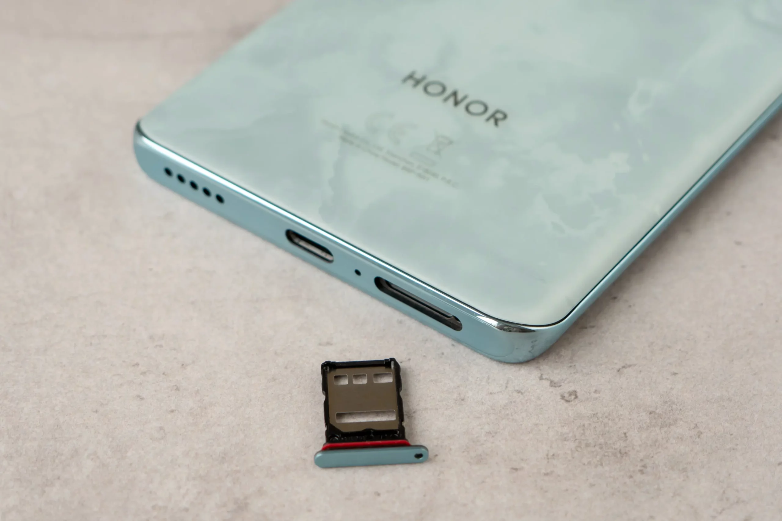 На нижней грани корпуса все привычно: разъем Type-C с поддержкой OTG, отверстия микрофона и основного динамика, а также лоток для двух SIM-карт. Места для установки карты памяти не предусмотрено, как нет и 3,5 мм разъема для наушников.