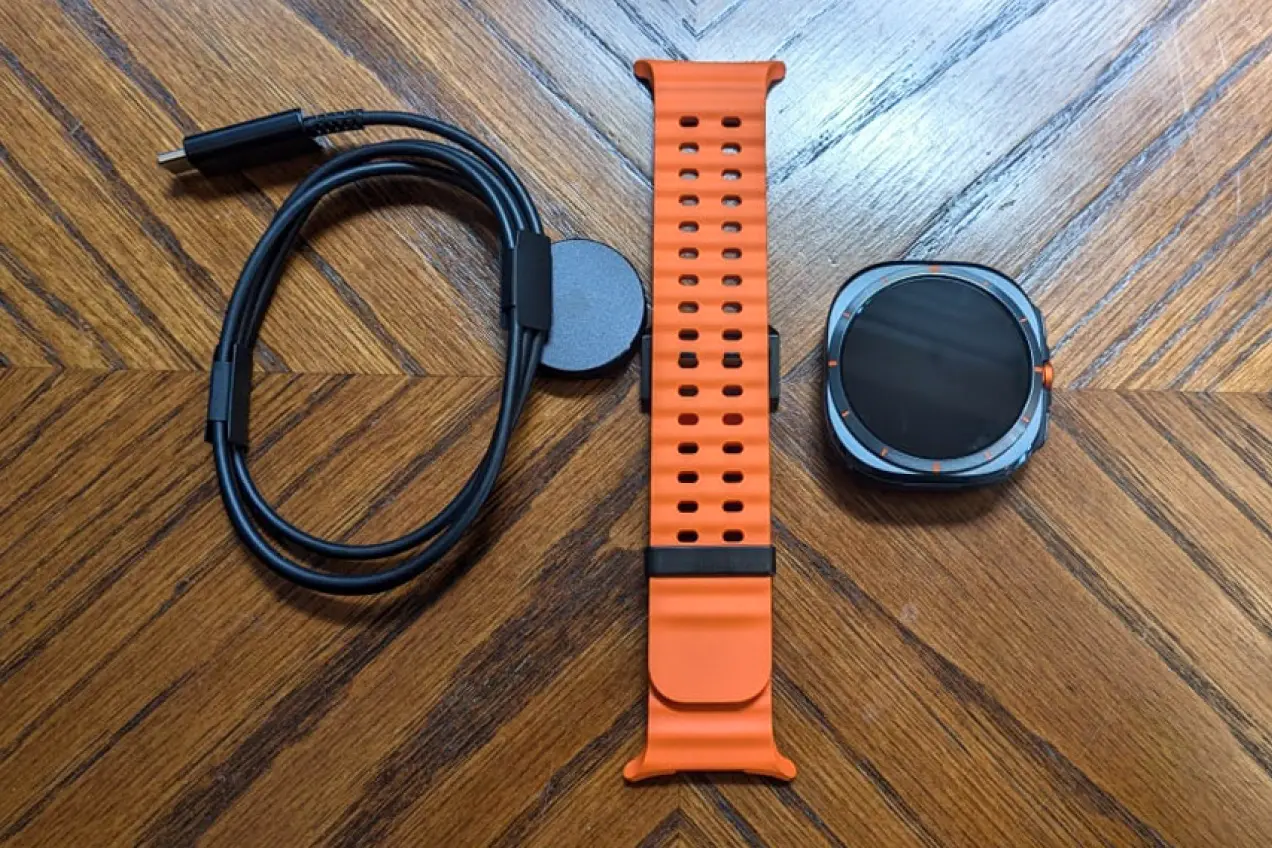 Так как Samsung входит в небольшое число самых заботящихся об экологии компаний, комплект поставки Galaxy Watch Ultra скромный. В коробке, помимо стандартной макулатуры, находятся магнитный зарядный кабель с USB-C, сами часы и ремешок к ним. Сетевой зарядный блок не положили.