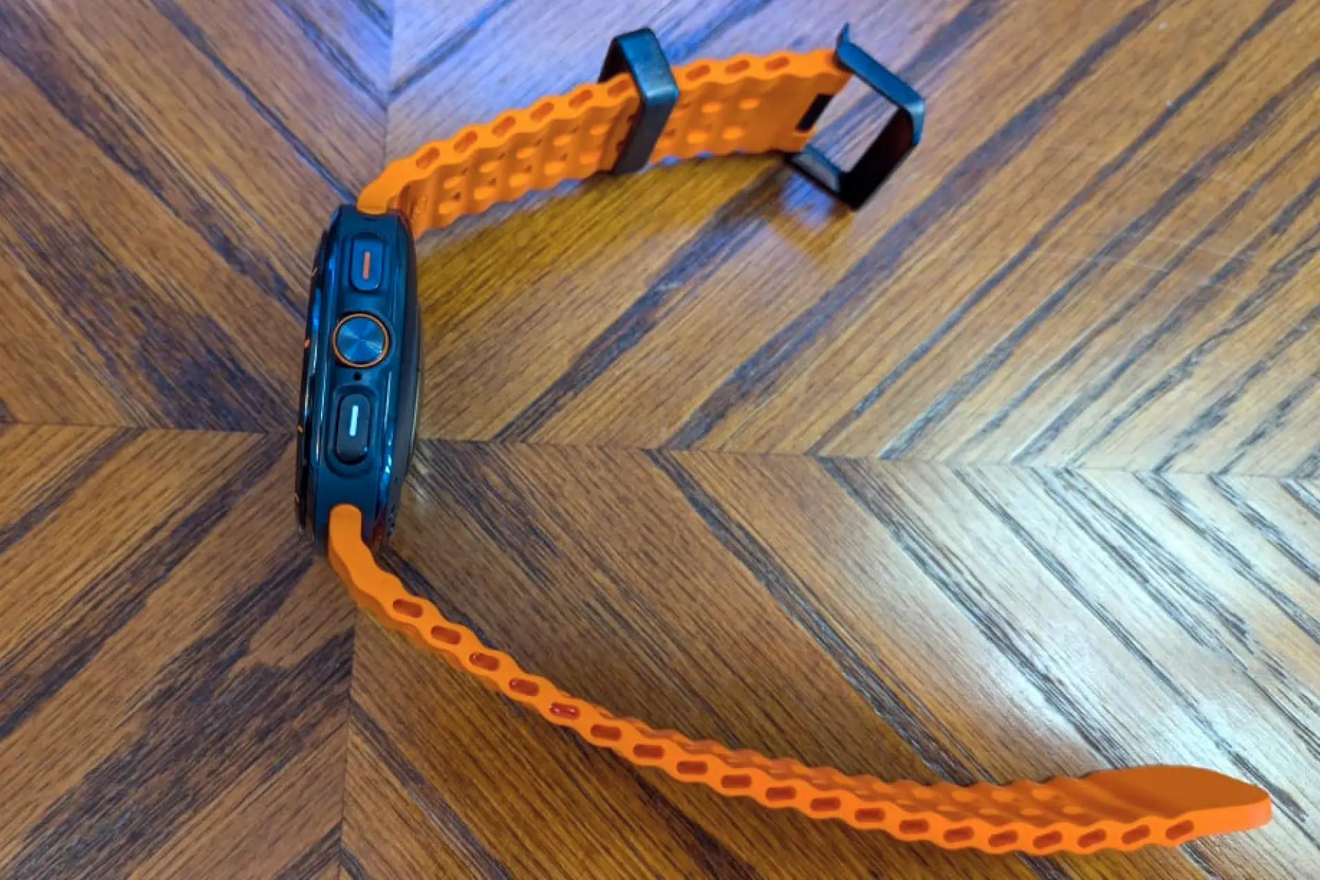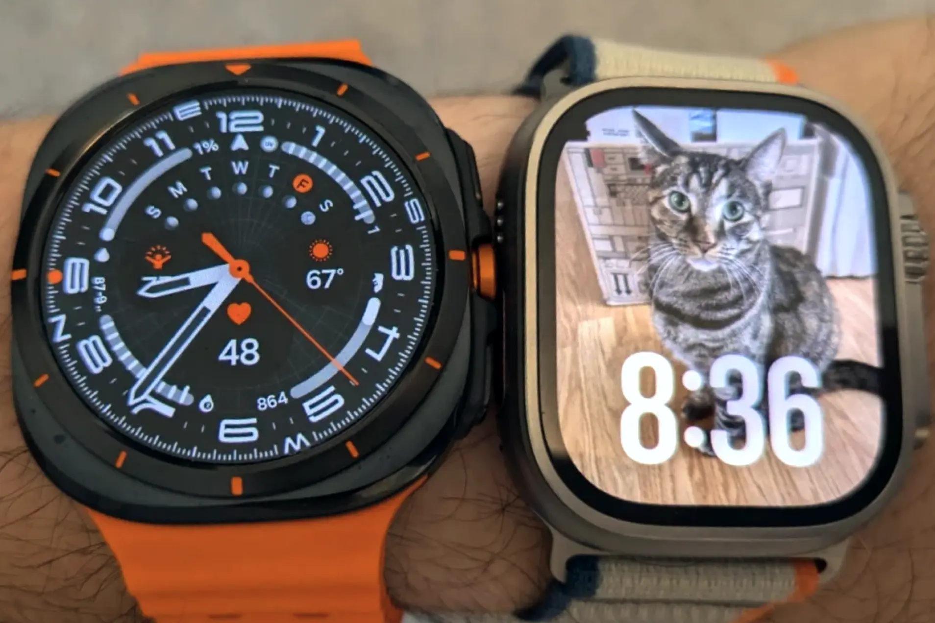 Невооруженным взглядом видно, что при создании Galaxy Watch Ultra разработчики Samsung вдохновлялись Apple Watch Ultra и хотели сделать максимально похожее устройство. Что ж, у них это получилось. Квадратный форм-фактор и оранжевые акценты действительно отсылают к «эпловским» флагманским смарт-часам. Вот только ради «квадратности» Samsung пришлось серьезно увеличить габариты устройства.