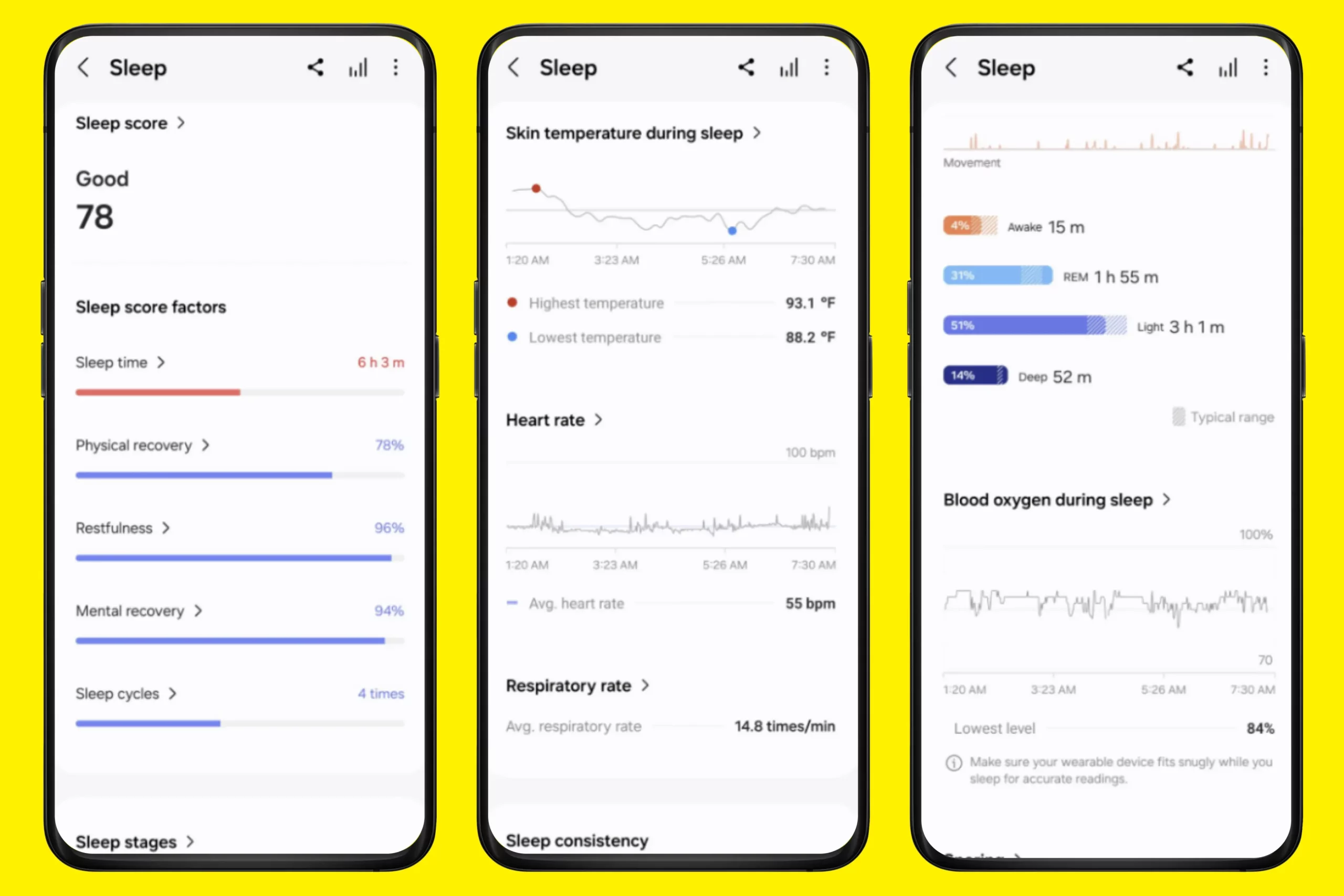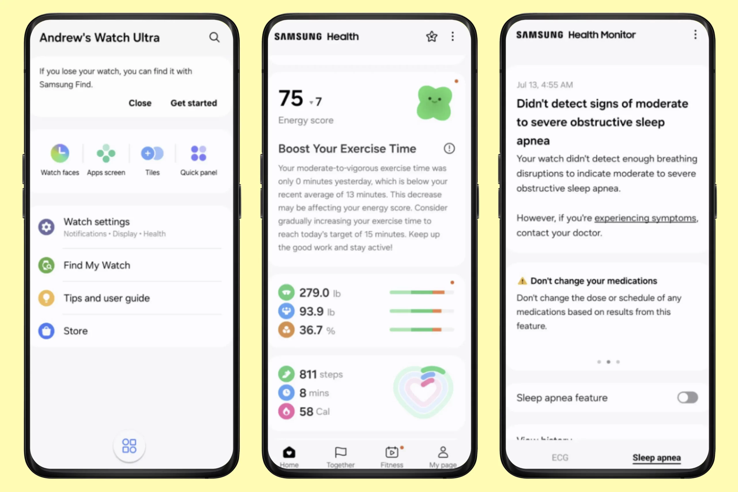 Помимо Energy score Galaxy Watch Ultra ставят отдельную оценку сну — в том же диапазоне: от 1 до 100. Проверить качество сна можно во вкладке «Сон» приложения Samsung Health. Вместе с общей оценкой тут можно найти данные о времени сна и его циклах, качестве отдыха, уровне физического/психологического восстановления и даже температуре тела, сердечном ритме, уровне кислорода в крови и циклах дыхания. Кстати, гаджет также может определять апноэ (храп). Это первые смарт-часы на рынке, получившие одобренную FDA (U.S. Food and Drug Administration) функцию определения апноэ.