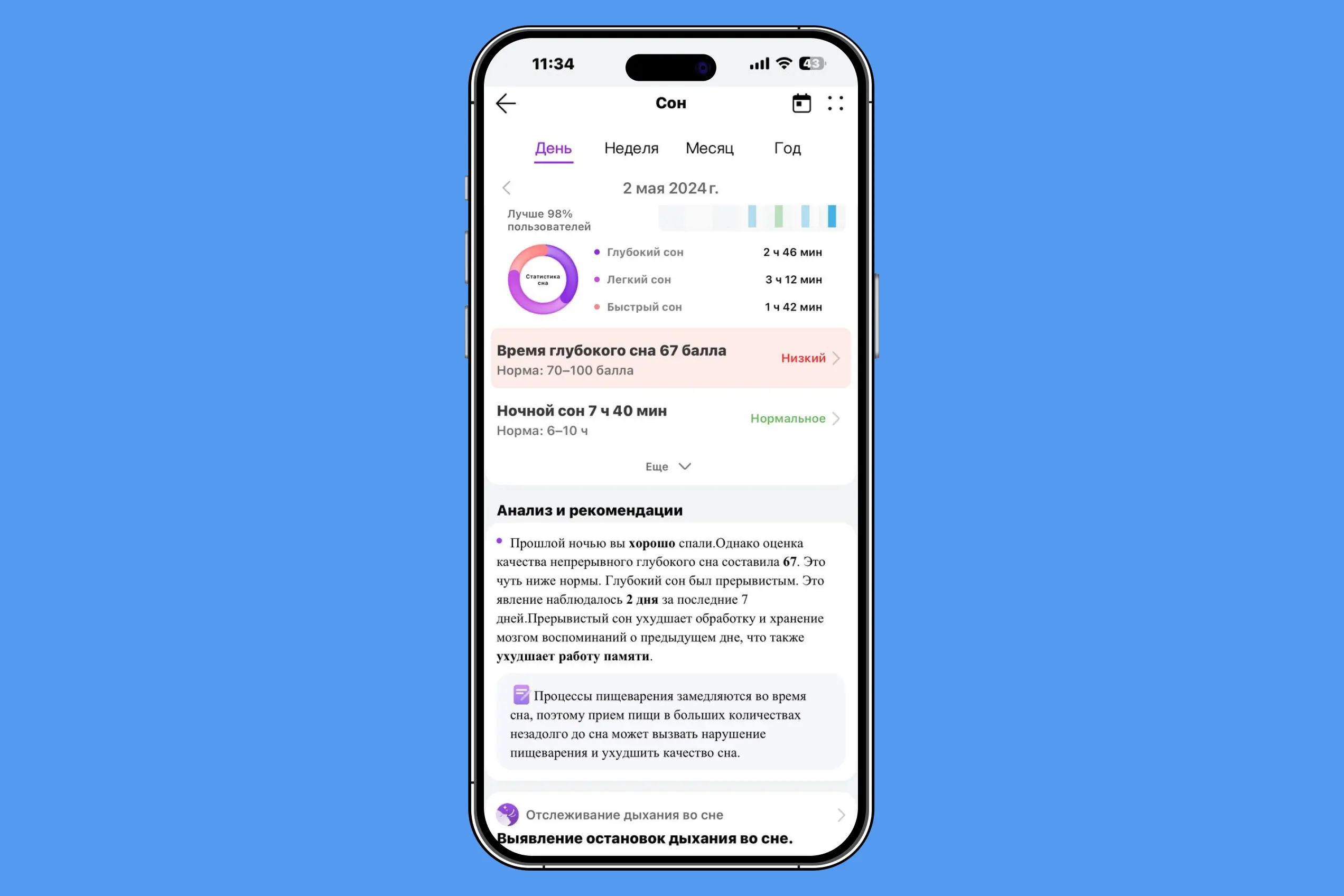 Я теперь знаю, что в среднем я высыпаюсь за 7,5 часов, что глубокий сон занимает 36% этого времени, легкий — 42%, а быстрый — 22%.