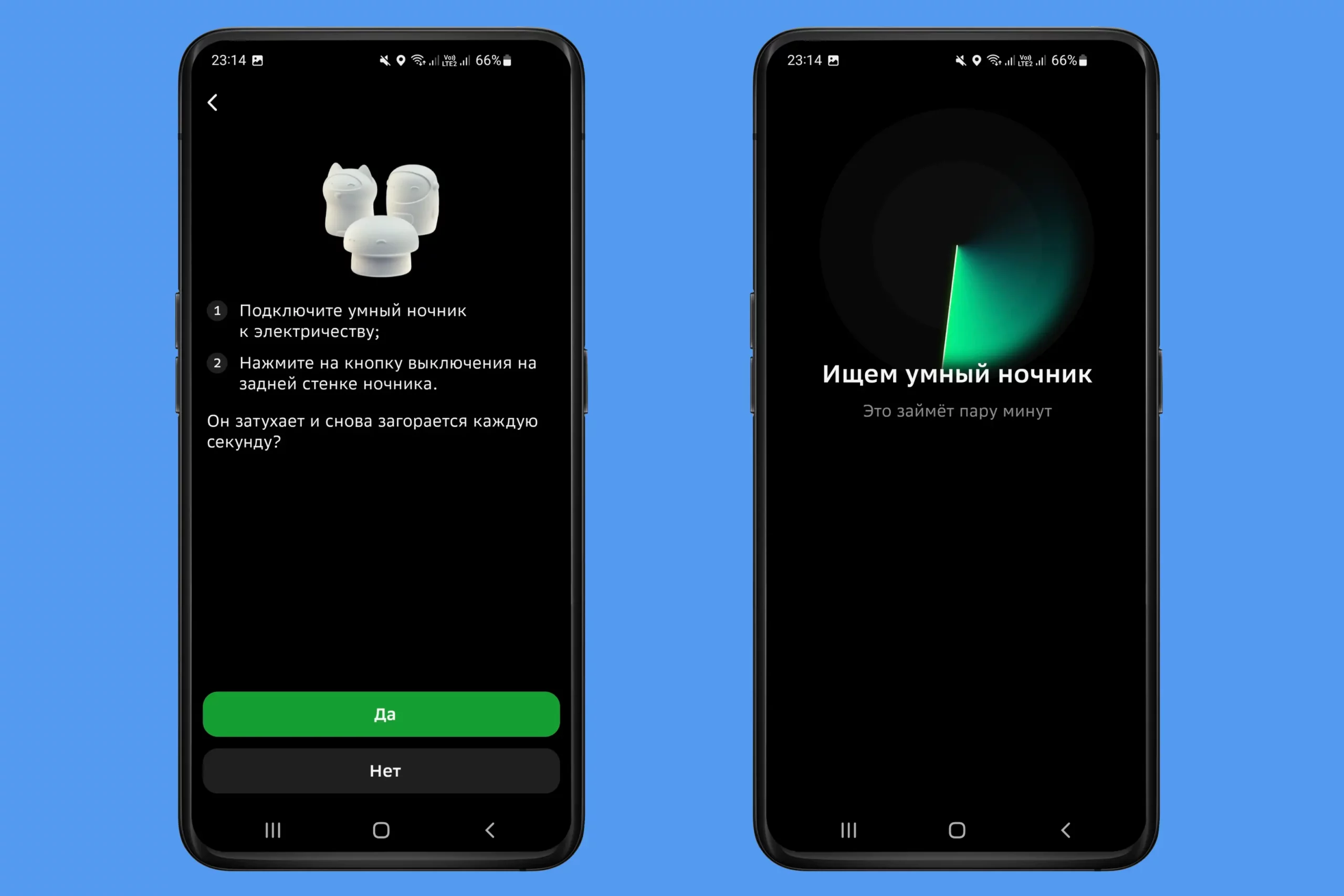 Нажмите на кнопку включения на корпусе. Когда ночник загорится теплым светом, приложение «Салют» начнет поиск устройства. Это может занять несколько минут.