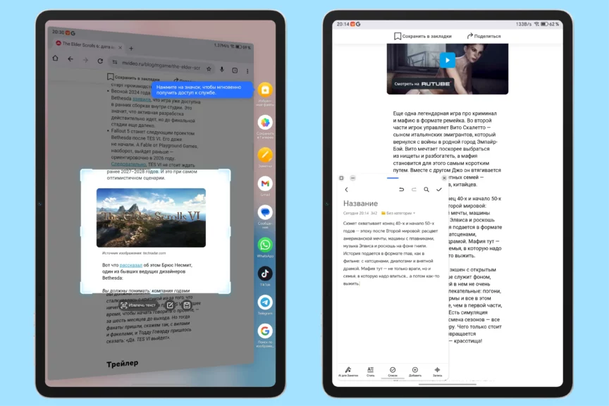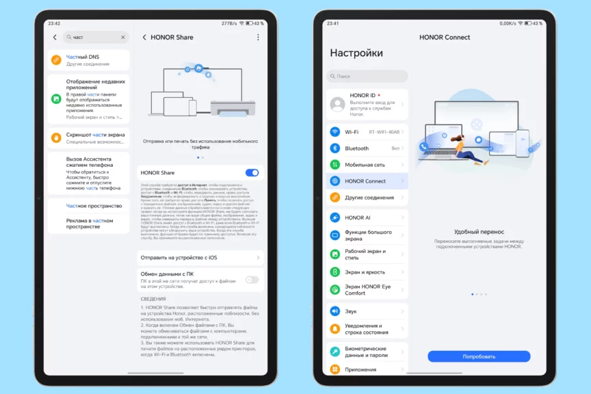 Есть и стандартная функция разделения экрана, Magic Text для извлечения текста из статьи, копирования и перевода. А также Magic Portal, отвечающий за быструю передачу текста или изображения в браузер и в другие приложения. Отображение мини-виджетов вверху экрана обеспечивает уже известная Magic Capsule. Работает и быстрая передача данных между устройствами бренда — HONOR Share.