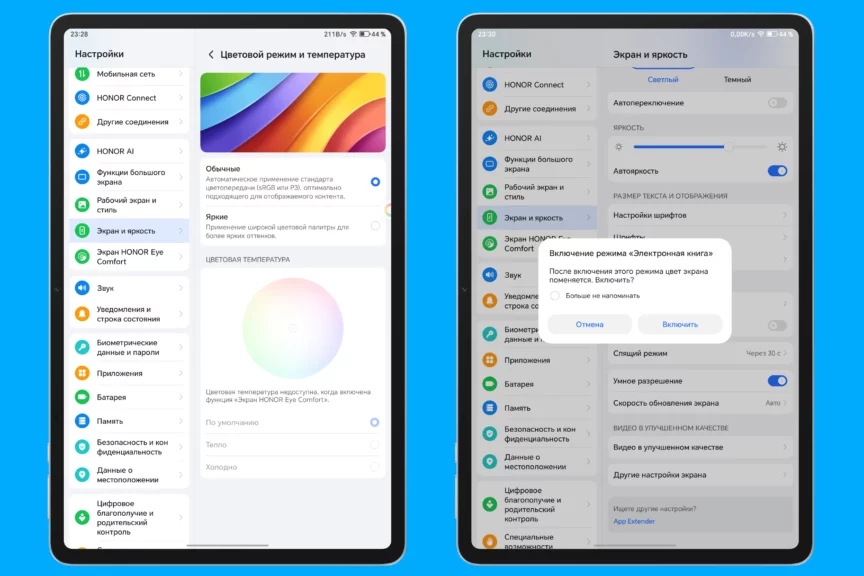 Также в настройках мы найдем «Циркадный ночной экран», подстраивающий цветовую температуру под время суток, и «Динамическую яркость», которая адаптируется под контент. И, конечно, для комфортного чтения есть «Режим электронной книги».