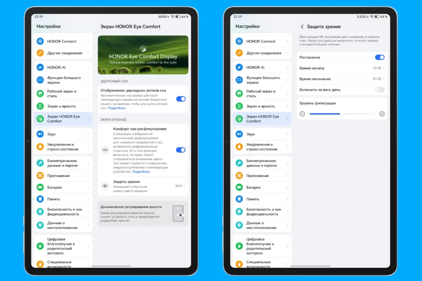 Не забываем про технологии защиты зрения. HONOR Pad 10 прошел двойную сертификацию TÜV Rheinland, подтверждающую, что экран бережет глаза от синего света и мерцания.