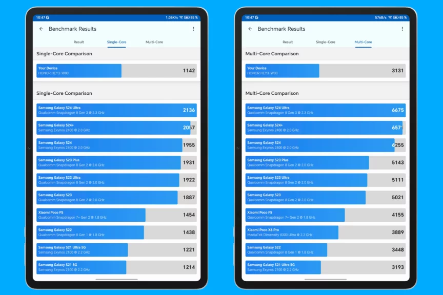 HONOR Pad 10 работает быстро, без лагов и рывков даже в режиме многозадачности. Это достаточно мощное устройство. Объем внутренней памяти — 256 ГБ, оперативной — 8 ГБ (есть версия 8+128 ГБ). Результаты синтетических тестов смотрите на фото.