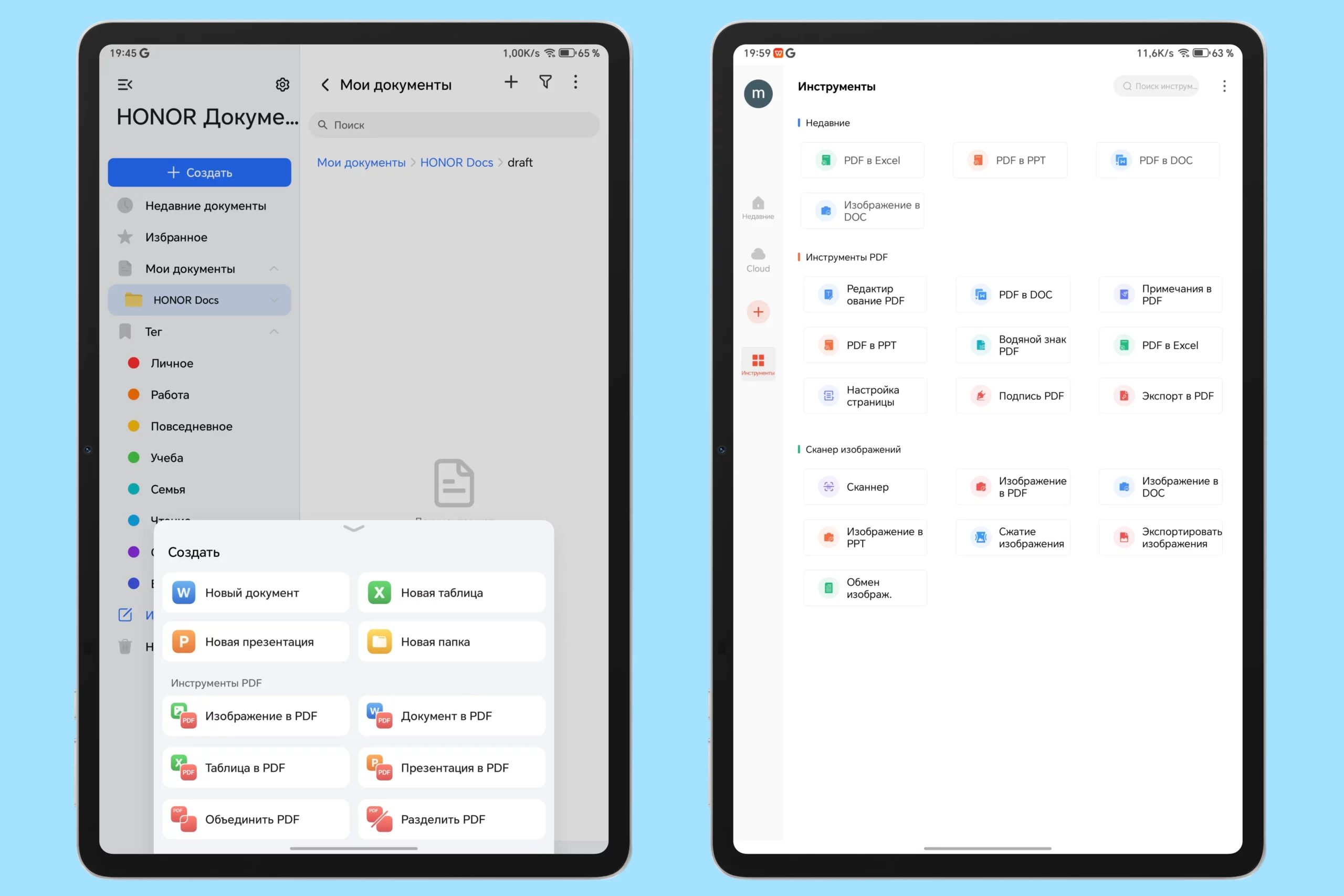 Как и его предшественник, HONOR Pad 10 поставляется с предустановленным бесплатным софтом «HONOR Документы». Можно работать в автономном режиме, создавать и редактировать документы Word, таблицы Excel и слайды PowerPoint, а также конвертировать изображения, документы и слайды в PDF. Это удобно, особенно если ваша работа связана с текстами и вы не хотите платить за Microsoft Office.