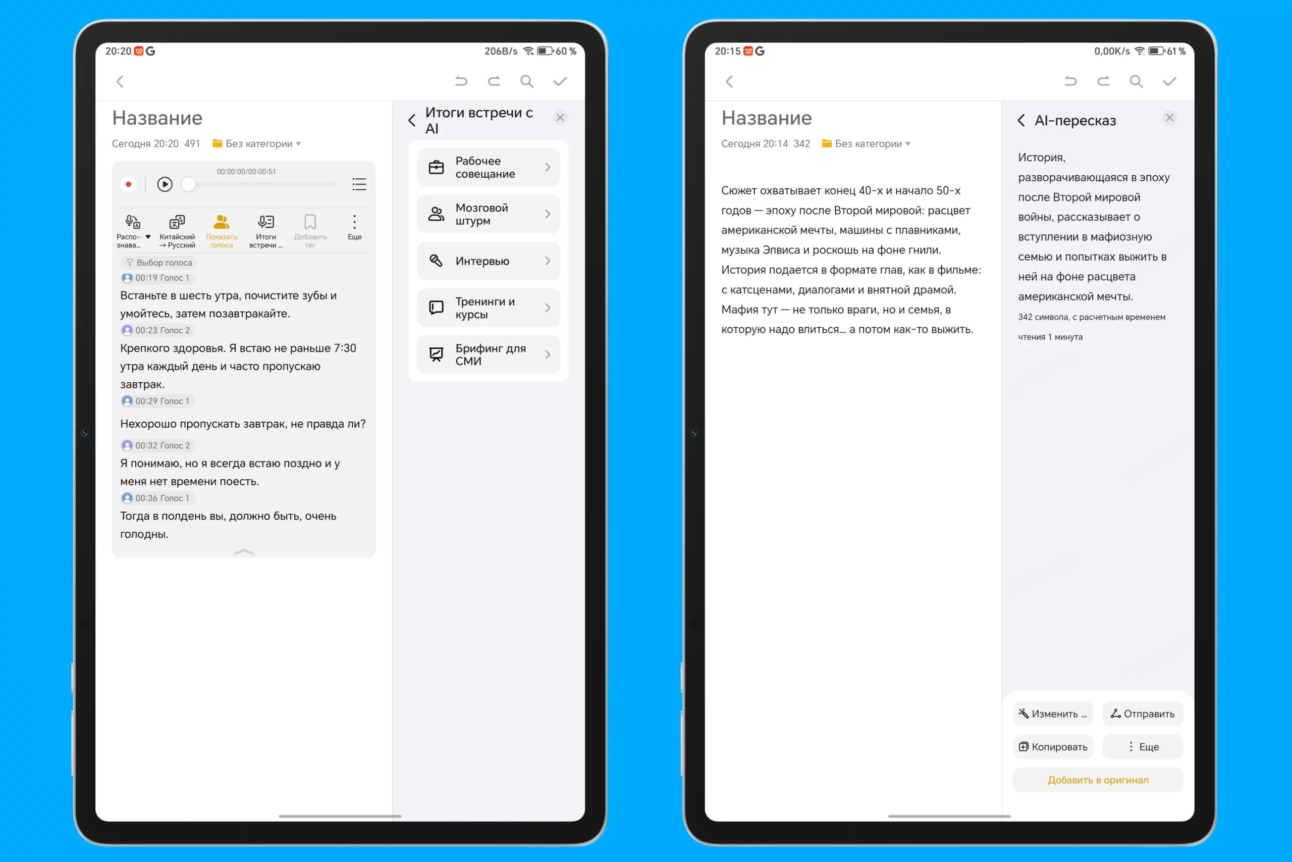 Основным помощником в учебе и работе является приложение «HONOR Заметки». В нем есть функции «AI-пересказ», «AI-форматирование» и «Итоги встречи с AI». Они помогут обобщить выделенный фрагмент, отформатировать текст и сделать его таким, каким вы хотите его видеть. Особенно это полезно для тех, кто много времени проводит на лекциях и совещаниях. Теперь можно записывать выступление спикера, переводить звуковую дорожку на доступные языки и преобразовывать в текст.