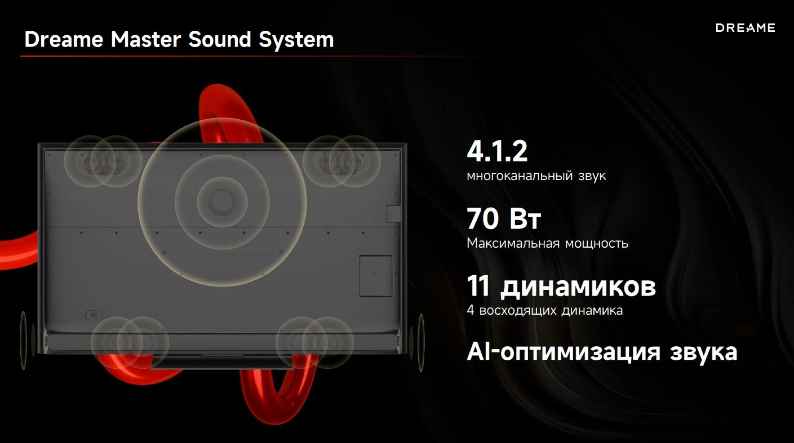 Больше не нужно докупать акустику. Система Dreamind Sound Engine подчеркивает чистоту голосов и создает объемное звучание, а поддержка Dolby Atmos переносит вас в центр действия.