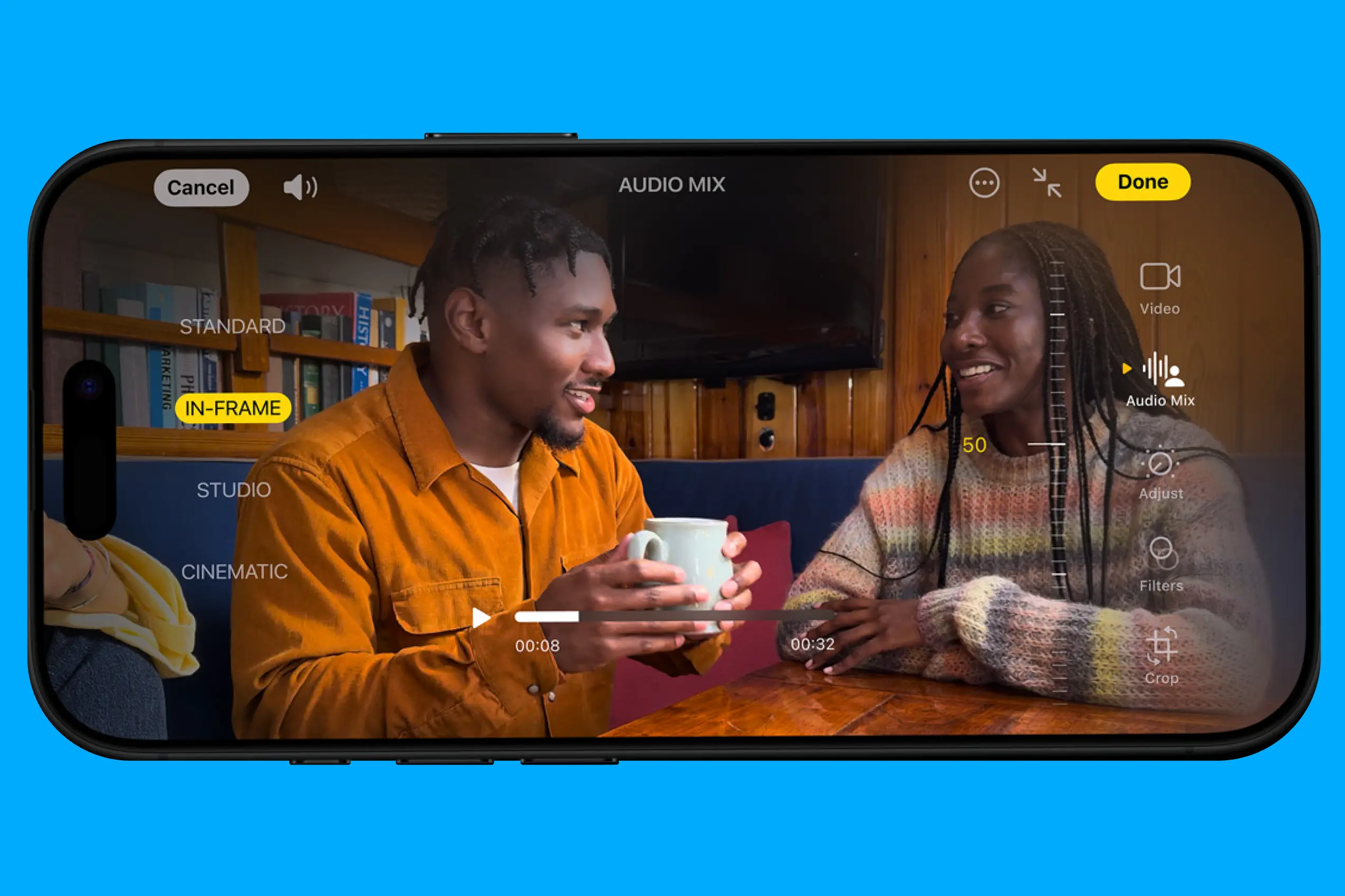 iPhone 16 Pro получил систему из четырех микрофонов студийного качества и новую функцию Audio Mix для управления звуком во время съемки видео. У нее есть четыре режима работы: