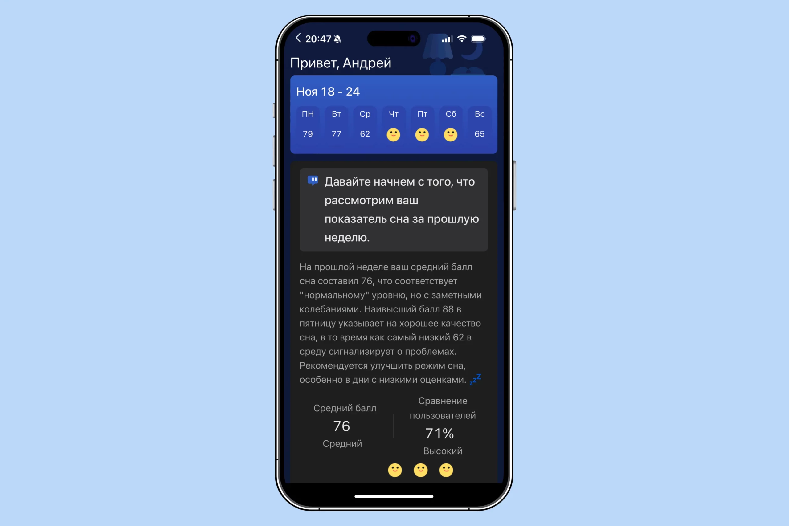 На основании данных о сне приложение формирует большой отчет за неделю и присылает его каждый понедельник. Но в первом отчете у меня была фраза: «Рекомендуется улучшить режим сна, особенно в дни с низкими оценками». Болеешь? Рекомендуется не болеть.