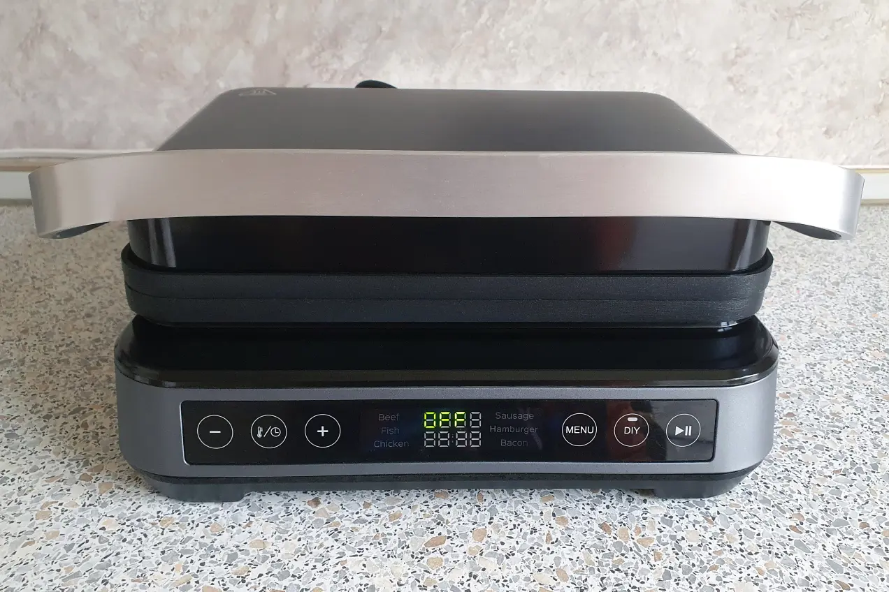 С первого взгляда на Carrera 674 понятно: вещь качественная. Сам гриль и его верхняя крышка тяжелые, металлические. Прибор устойчивый, а благодаря универсальному дизайну (сталь и черный пластик) впишется в любой кухонный интерьер. Управление сенсорное, с небольшим информационным дисплеем. На нем отображается разная полезная информация вроде таймера, температуры и выбранного режима.
