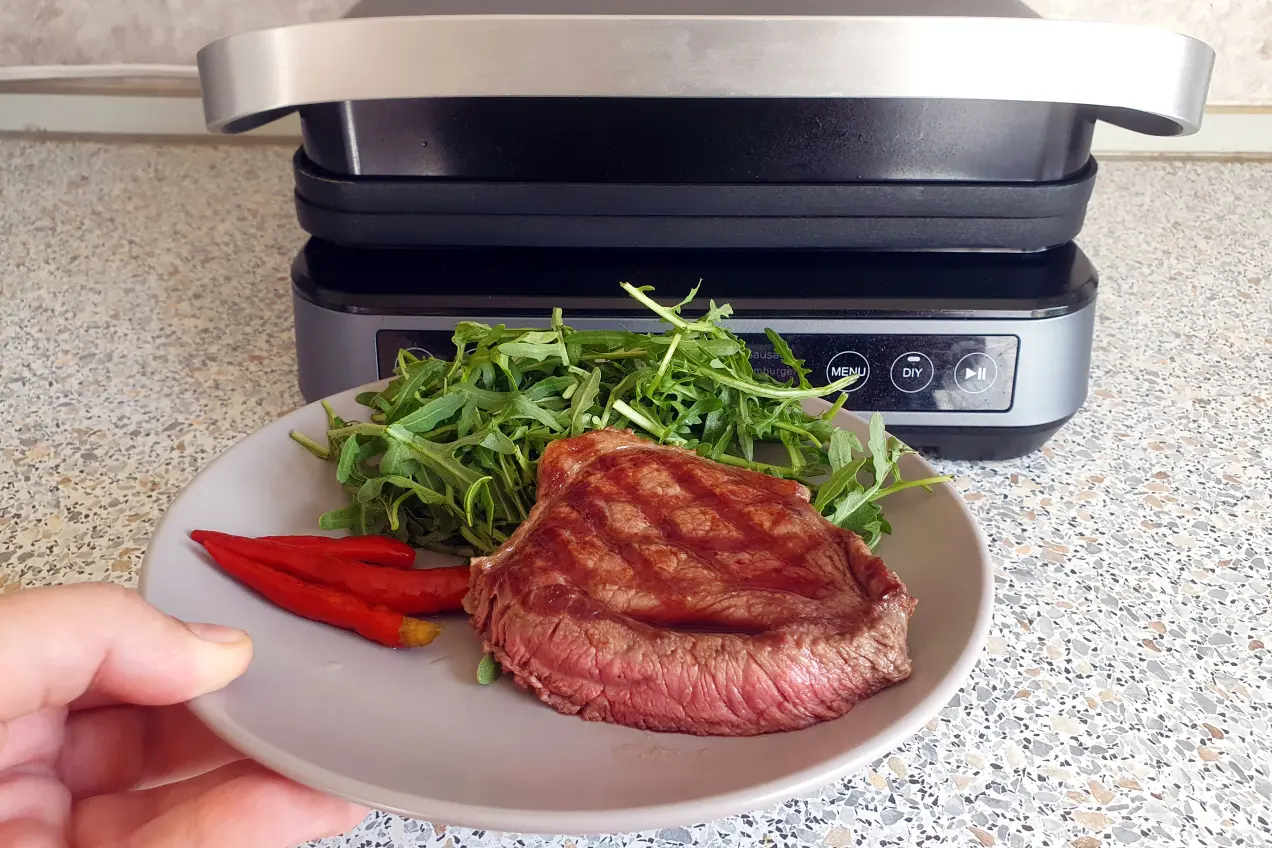 Гриль я включаю на предварительный нагрев в режиме «Мясо», а после звукового сигнала выкладываю стейк. Также звуком прибор подскажет, что настала пора снимать с гриля готовое блюдо. Приготовление стейка заняло у меня 4 минуты. Вкус изумительный! Мясо отлично прожарилось, внутри сохранило сочную текстуру, не пересушилось и не подгорело.
