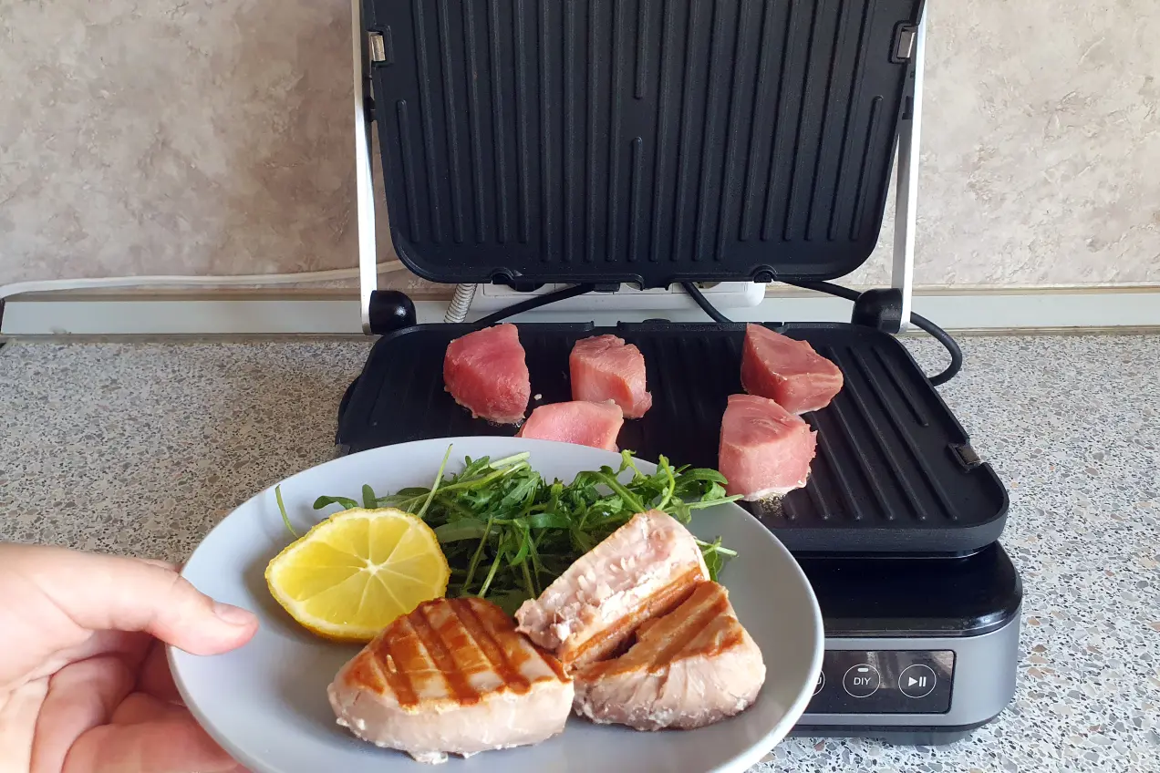Еще один вариант вкусного и полезного обеда — поджаристый тунец на гриле. Его я, в отличие от курицы, не мариную. Просто смазываю солью. Включаю программу «Рыба». После предварительного разогрева выкладываю тунца на гриль. Благодаря специальному режиму рыба получилась очень сочной. Внутри, как и нужно, слегка розоватой.