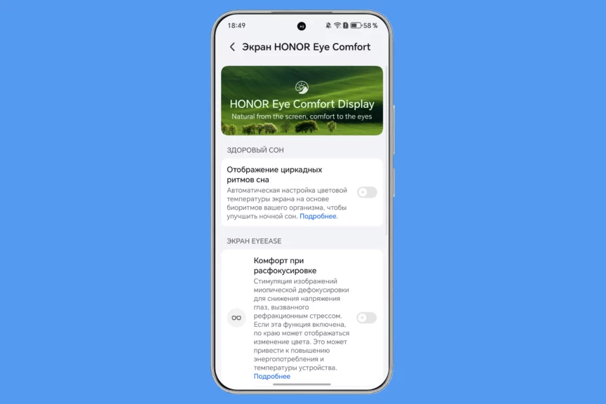 Кроме высокой яркости, у новинки есть ряд дополнительных функций, которые выгодно выделяют этот смартфон. Например, управление мокрыми пальцами. Капли на экране не мешают скроллингу и даже набору текста. Есть циркадный режим и функция защиты глаз от вредного синего излучения.