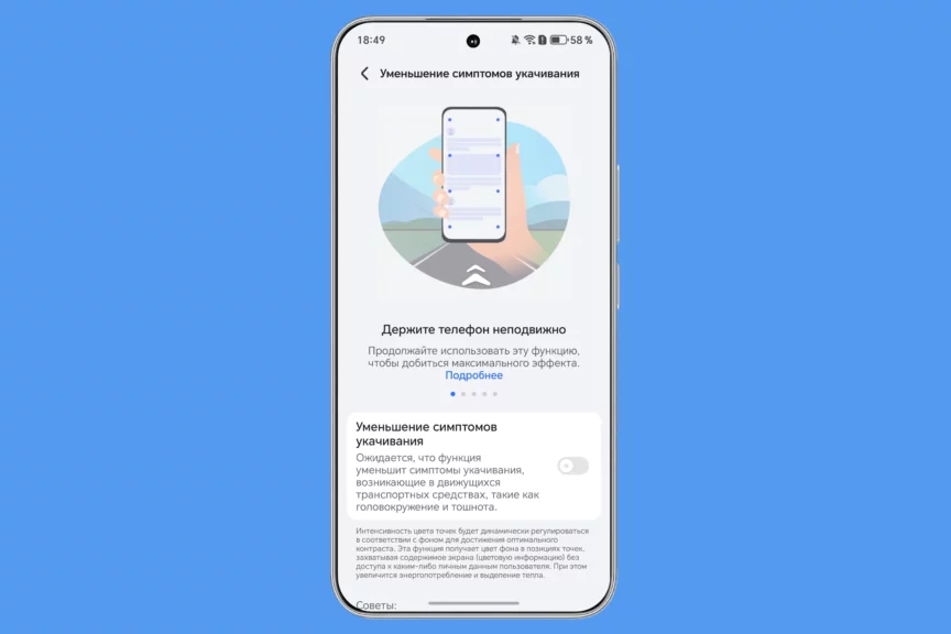 Интересной функцией стала защита от укачивания. При ее включении на экране появляются контрастные точки, которые перемещаются в зависимости от ускорения: при разгоне, торможении, на поворотах. Взгляд следует за ними, и в итоге укачивание воспринимается не так остро.