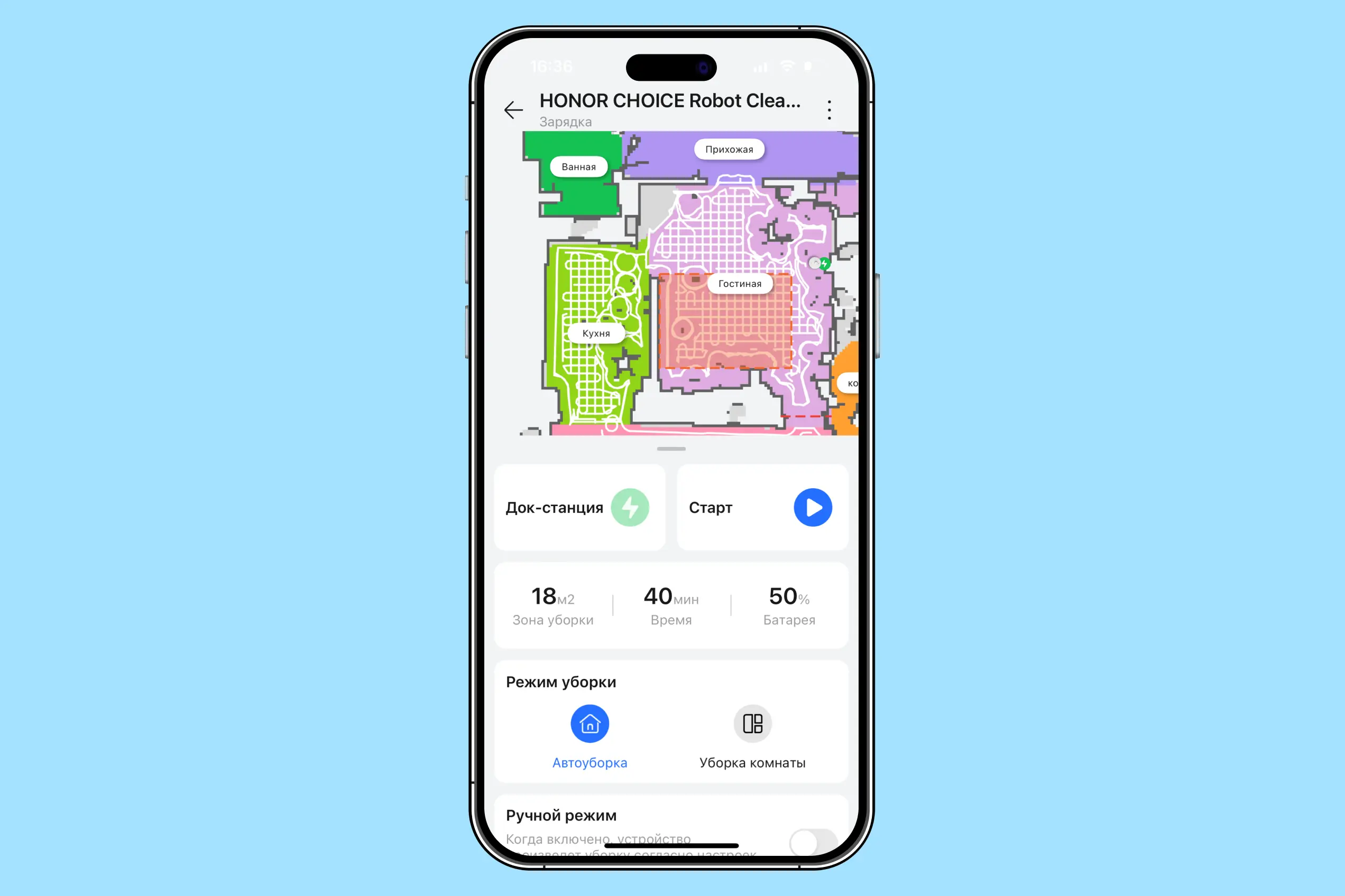 В первый запуск робот сам строит карту помещения. У нас получилось 38 кв. м рабочего пространства — если считать без мебели. Каждую комнату можно назвать как хочется.