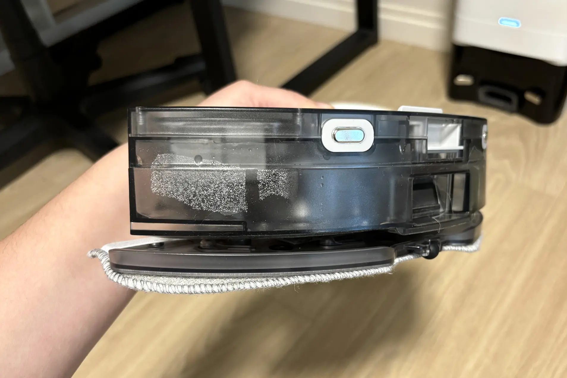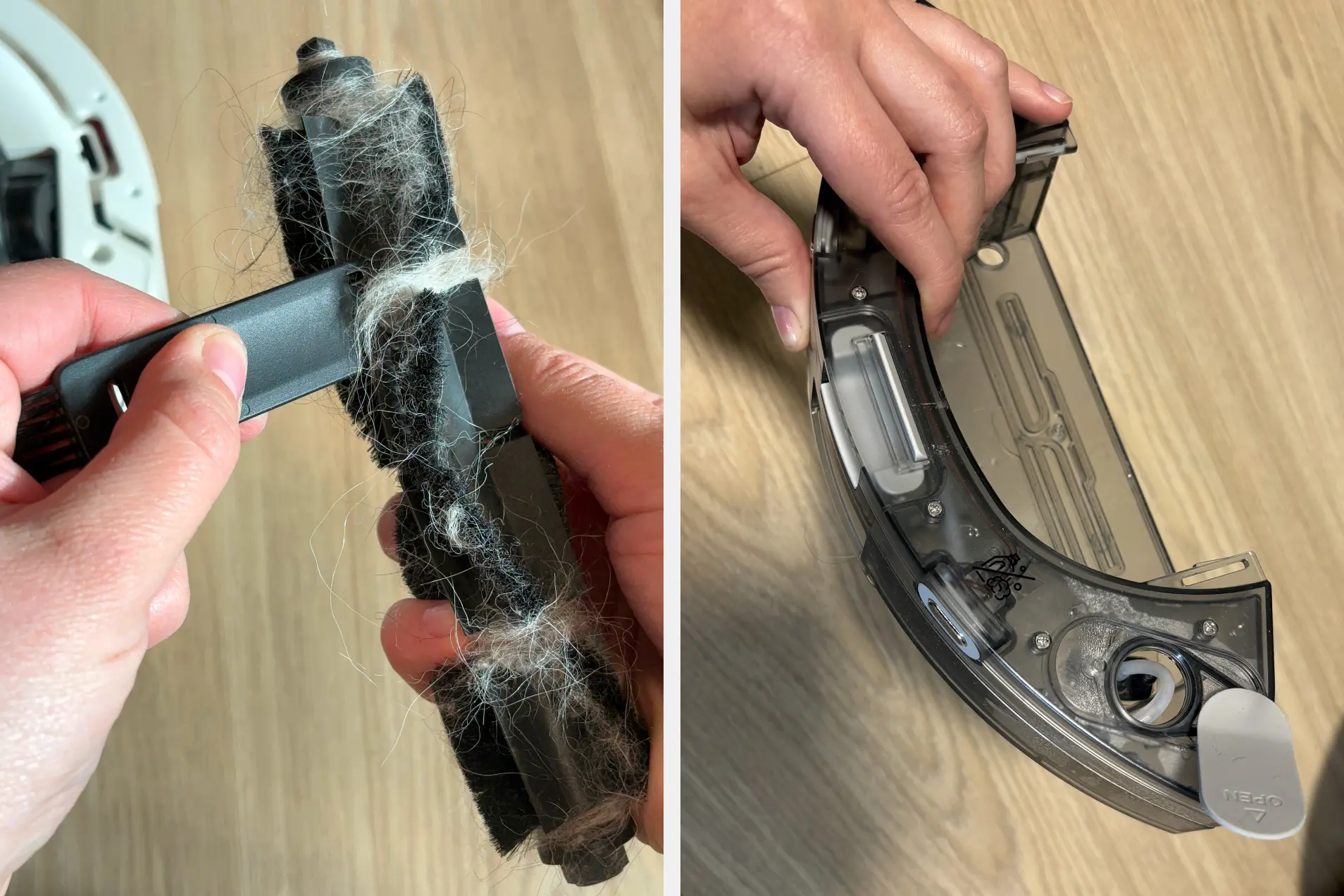 Но на щетке была не вся шерсть с пола. Основная масса ушла в станцию самоочистки. Поэтому делаем вывод: обязательно нужна модель со станцией. Без нее робот забивался бы за одну ходку — приходилось бы всякий раз вручную очищать пылесборник.