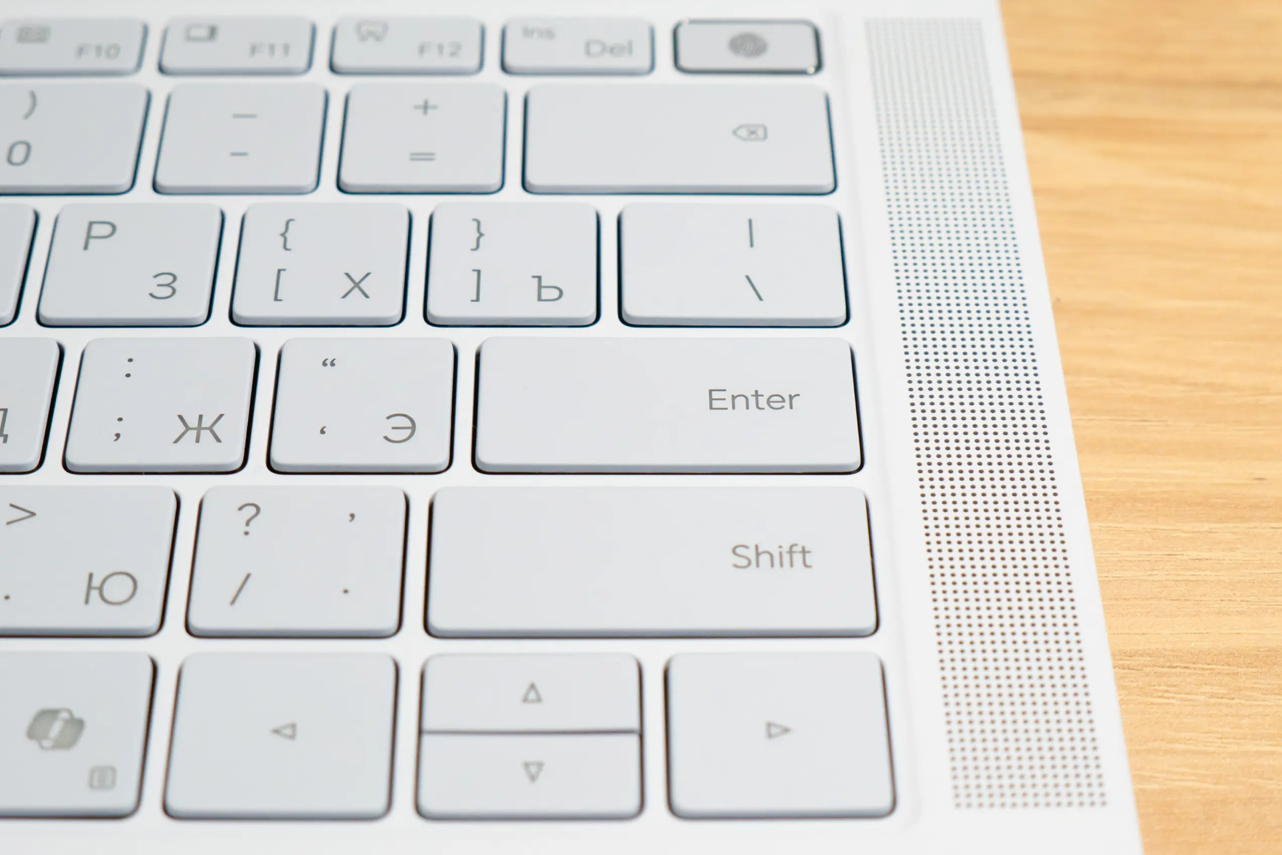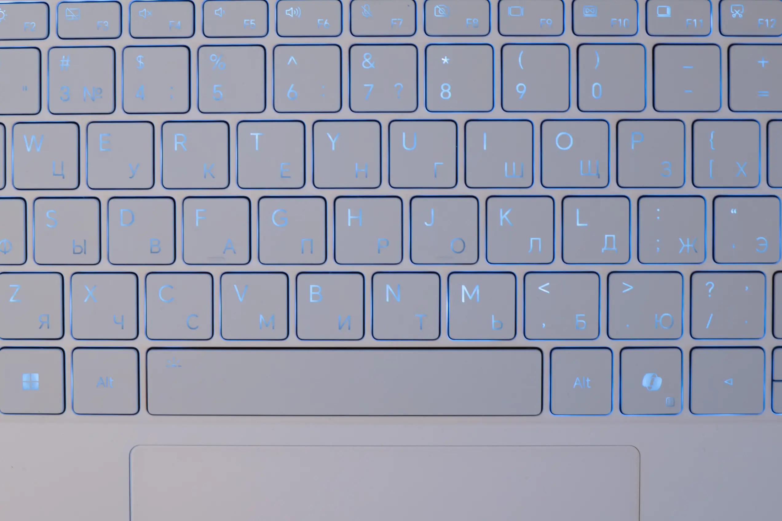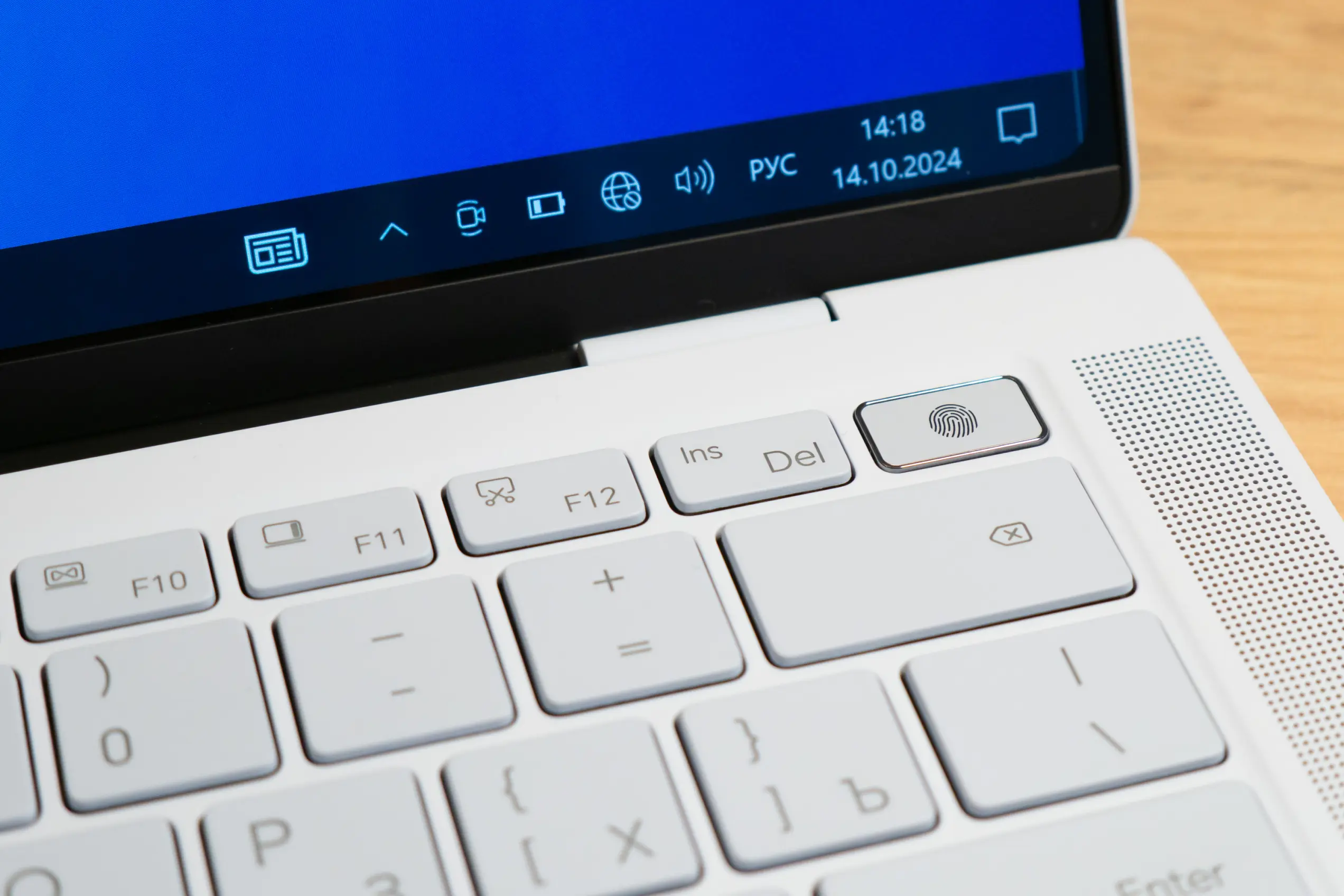 Клавиатура с мягким, тихим ходом в 1,5 мм имеет белую подсветку. Из компромиссных клавиш отмечаем зауженные габариты буквы «е» и уменьшенные стрелки «вниз» и «вверх». Зато шифты, Back Space и Enter полноразмерные. В кнопку питания встроен сканер отпечатка пальца.