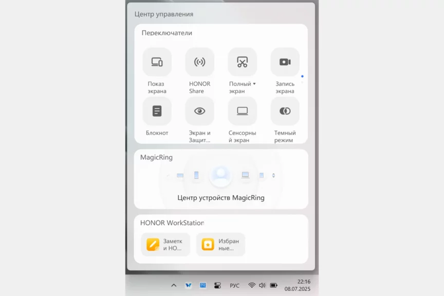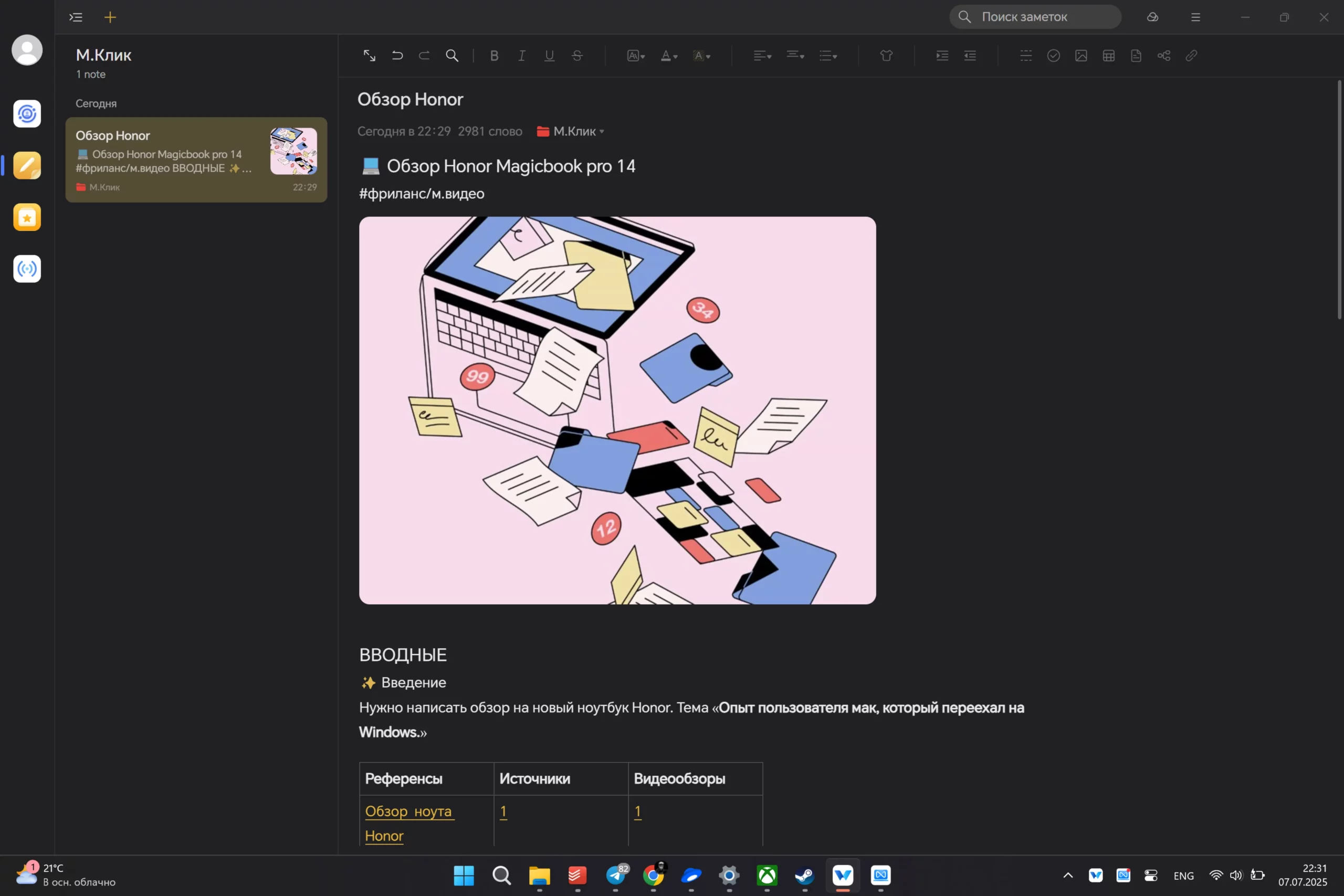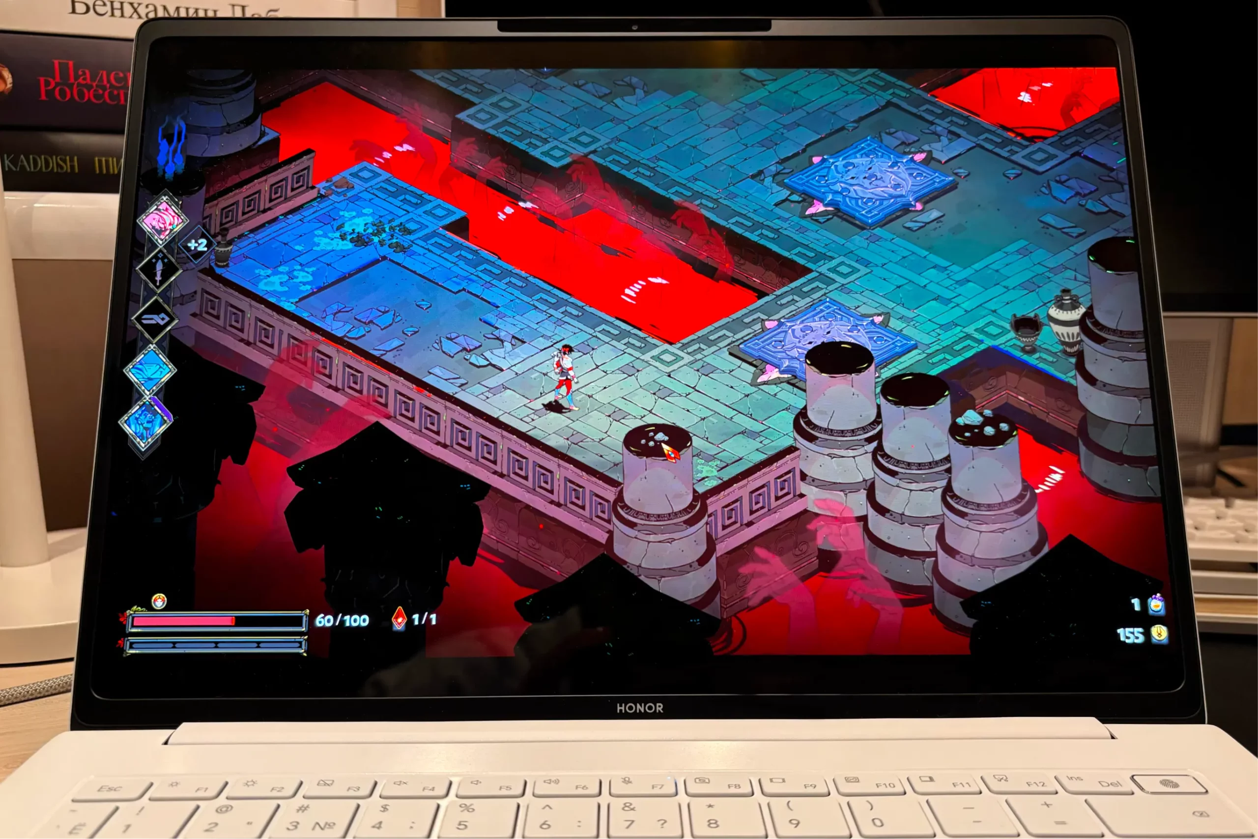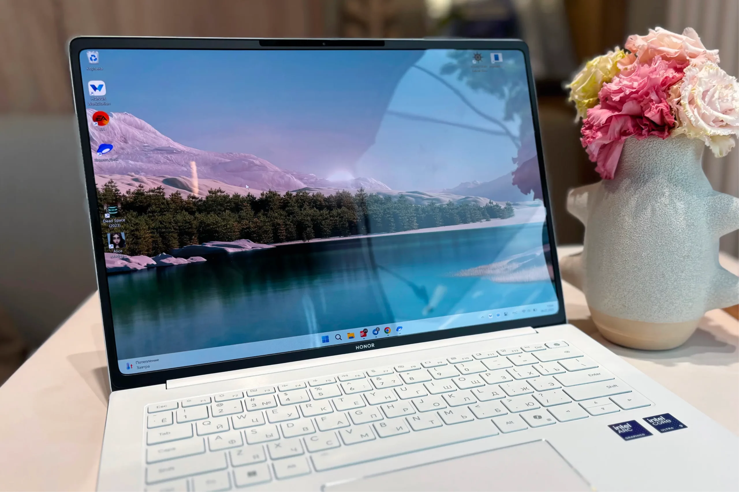 Когда я достал ноутбук из коробки, меня ждало два откровения. Во-первых, ноутбук очень легкий и весит меньше 1,5 кг. Мой MacBook Pro на 14 дюймов при всей компактности весит почти 2 кг, и эта разница ощущается. При этом лэптоп от HONOR довольно тонкий: меньше двух сантиметров в толщину. В общем, с ним приятно кататься по городу, сидеть в офисе, работать в кровати и так далее.