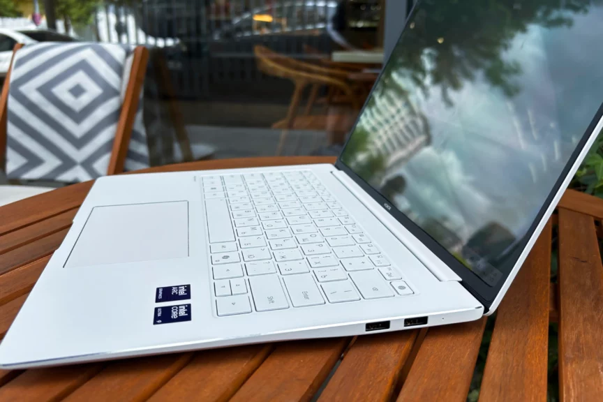 По портам: на левой грани расположились HDMI 2.1 с возможностью вывода изображения в 4К с частотой 60 Гц, 2 порта USB-C 3.2 (через них же идет зарядка) и разъем 3,5 мм для наушников. Справа есть 2 порта USB-A, так что переходник не понадобится.