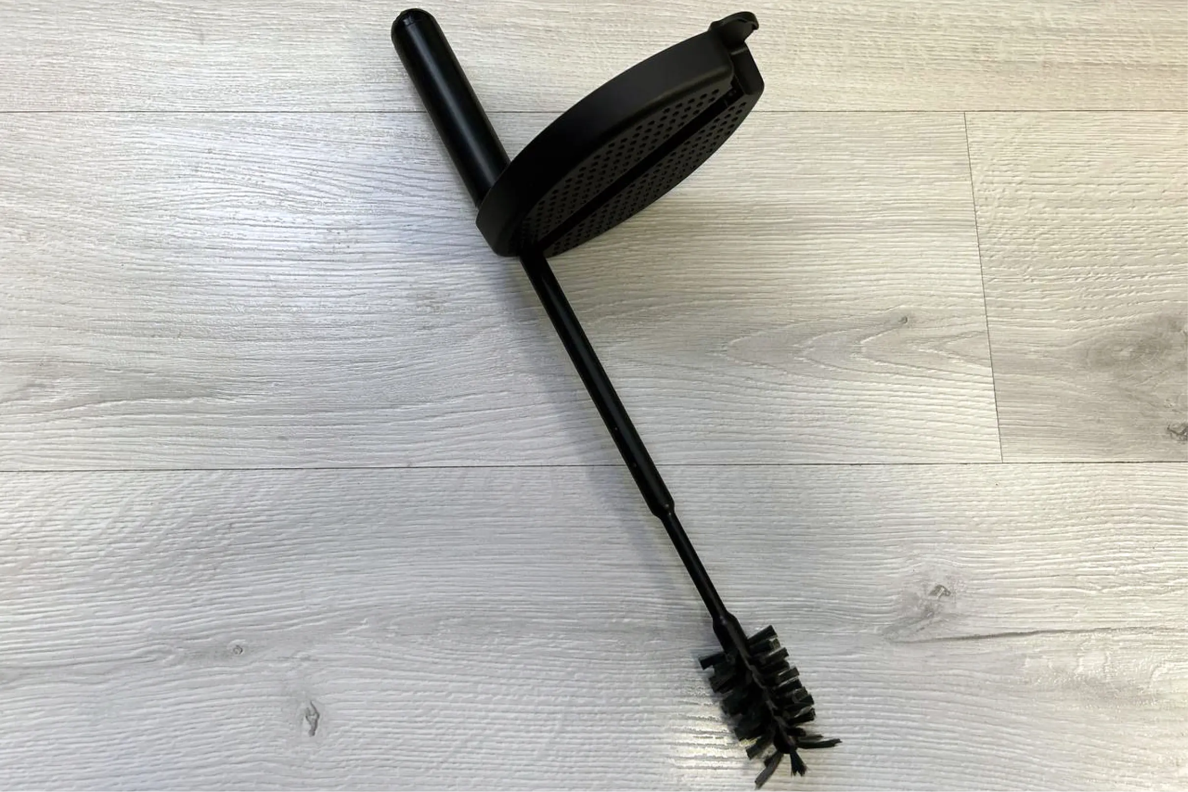 Во время уборки вода постоянно поступает на роликовую щетку. Вращающийся ролик эффективно собирает мусор и удаляет пятна с пола. Грязь всасывается и попадает в нижний контейнер. За роликом расположен скребок, который счищает налипшие на него пыль, шерсть или волосы. Скребок довольно много грязи собирает на себя, поэтому его периодически нужно чистить ершиком из комплекта.