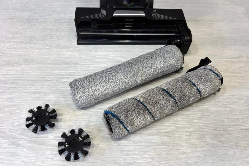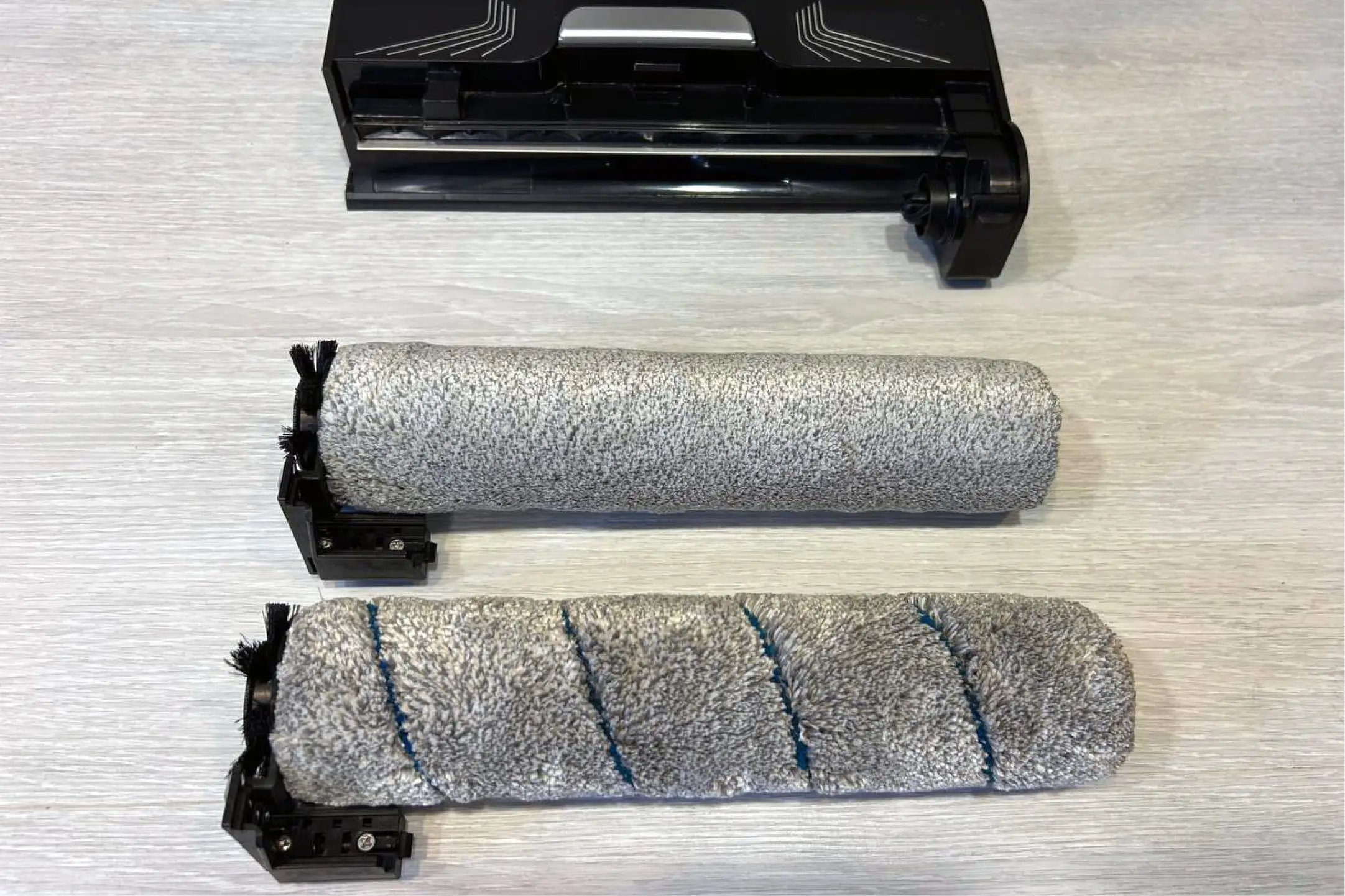 В комплект входят 2 ролика. Один белый, второй — белый с синими полосами. На каждом сбоку стоит щетка. Материал роликов — микрофибра с плотными ворсинками. Белый ролик предназначен для поддержания чистоты. Полосатый лучше оттирает пятна, но напольные покрытия не царапает. После мойки пол высыхает примерно через 3 минуты. Никаких следов и разводов не остается ни на плитке, ни на ламинате.