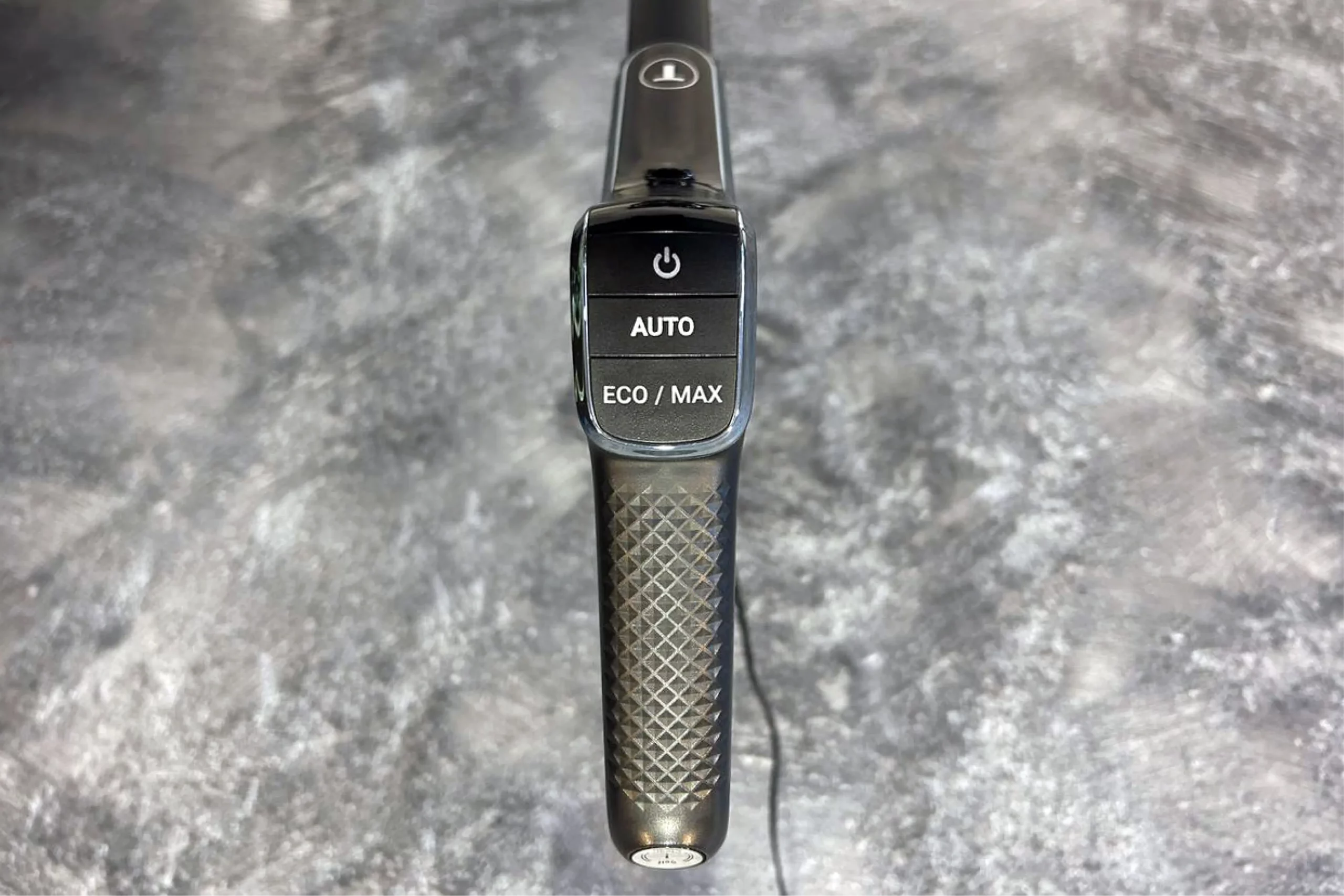Все управление расположено на ручке. Это кнопки включения и выбора режимов AUTO и ECO/MAX. Для запуска нужно не только нажать клавишу, но и наклонить ручку пылесоса вниз. Если пылесос стоит вертикально, он не включится.