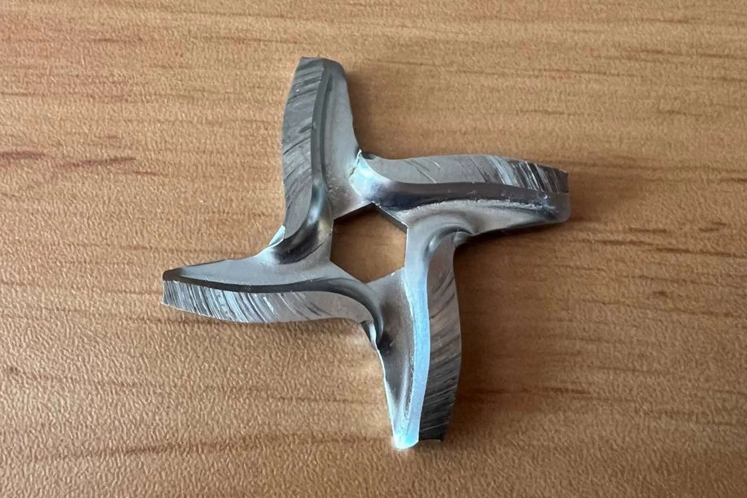 Такая форма позволяет добиться более эффективной нарезки по сравнению с ножами другого типа. Как и у любого ножа, при длительном использовании сталь может затупиться и снизить эффективность работы. В таком случае достаточно плотно затянуть фиксирующую гайку шнека и включить мясорубку вхолостую. Через несколько минут холостой работы режущие свойства ножа будут восстановлены. После этого необходимо промыть все подвижные детали — и можно дальше работать с продуктами.