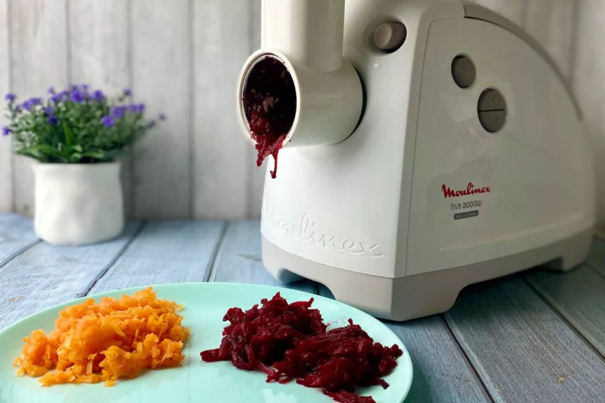 Мясорубка с задачей справилась. Измельчить овощи получилось значительно быстрее, чем вручную. Кроме терки, которую я использовал для салата, у модели есть крупная терка, насадка для нарезки слайсами, терка для драников.