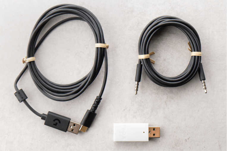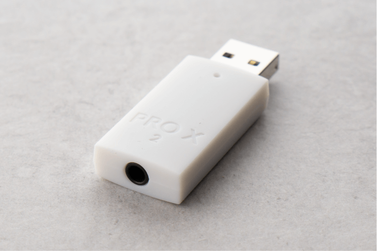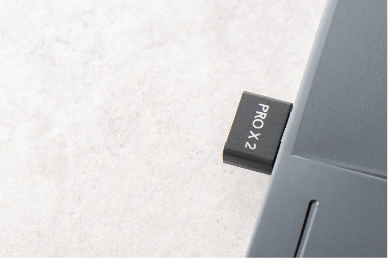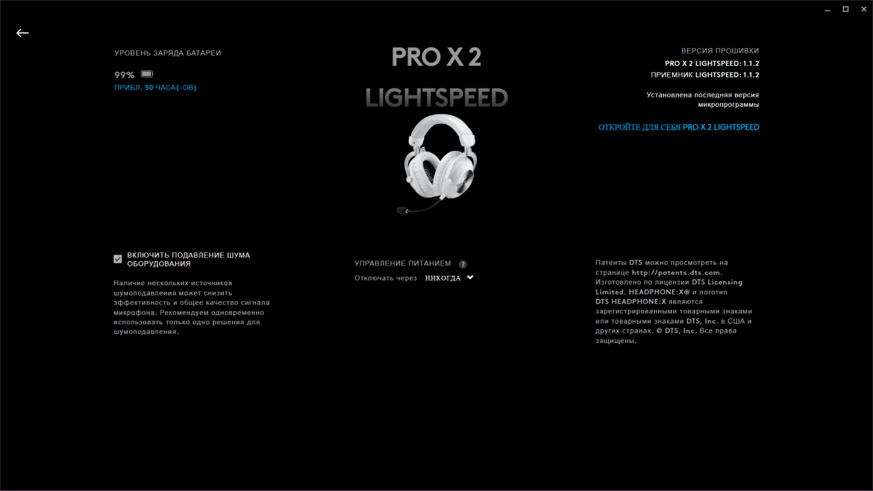 Основной способ подключения Logitech PRO X 2 LIGHTSPEED к компьютеру — USB-радиопередатчик. Только при таком подключении доступна функциональность приложения Logitech G Hub, а также объемный звук DTS. Используется частота 2,4 ГГц, а радиус работы заявлен в пределах 30 метров. В городской квартире с перегруженным диапазоном 2,4 Гц проблем с передачей нет, даже если уйти в соседнюю комнату или на кухню.