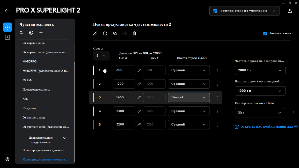 Начнем с того, что чувствительность мыши можно настроить с большой точностью. Обновленный сенсор Hero 2 обеспечивает разрешение от 100 до 32 000 dpi с шагом всего в 10 dpi! Так что при переходе с любой другой мыши можно подобрать абсолютно аналогичную чувствительность. Более того, чувствительность может быть раздельно настроена для вертикальной и горизонтальной оси. В дополнительных настройках также можно выбрать высоту отрыва мыши (LOD). Все кнопки программируются, им можно назначать сочетания клавиш, команды и даже макросы. А все настройки можно хранить не только в приложении, но и во встроенной памяти самой мыши. В этом случае при подключении к другому устройству мышь будет работать так же, как на «родном» компьютере.