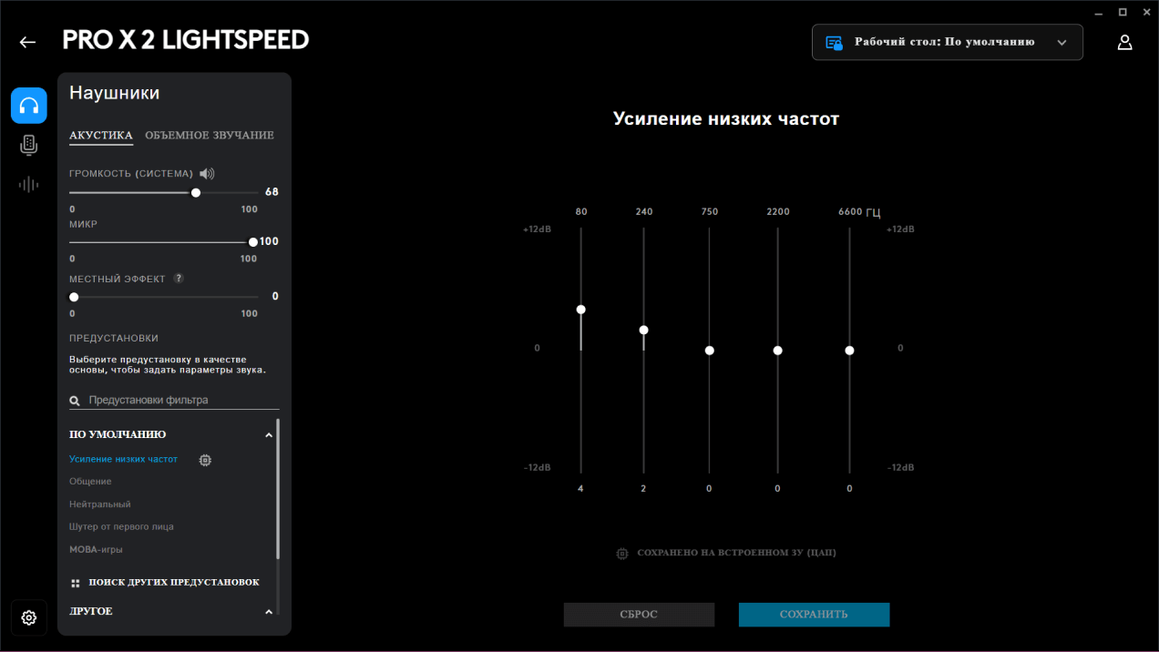 Захочется настроить звук под себя — не проблема. В приложении Logitech G Hub есть эквалайзер и даже заранее созданные профили для разных жанров игр. Я, например, для стрелялок немного убрал басы. Приложение капризное, в нашем испытании корректно установилось лишь с третьей попытки.
