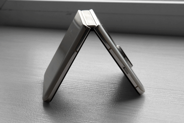 «Аккуратный и элегантный», — вот первые слова, которые приходят в голову после распаковки OPPO Find N3 Flip. У смартфона строгий универсальный дизайн. Передняя часть с маленьким экраном сделана из матового пластика, а задняя панель выполнена из защитного стекла Gorilla Glass. Материал торцов и шарнира — алюминий. Он красиво переливается на свету и устойчив к загрязнениям от отпечатков пальцев.
