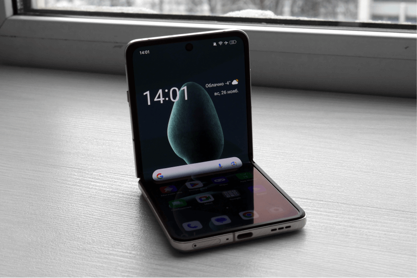 В закрытом состоянии толщина телефона 16,45 мм, в раскрытом — всего 7,79 мм. Его удобно положить в карман, а в открытом виде он более тонкий и легкий, чем некоторые классические смартфоны.