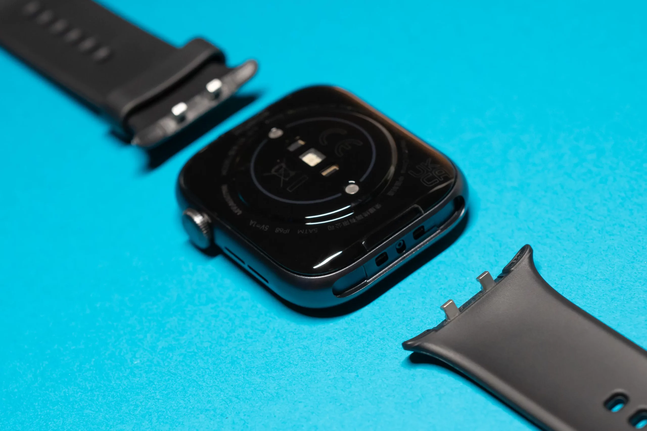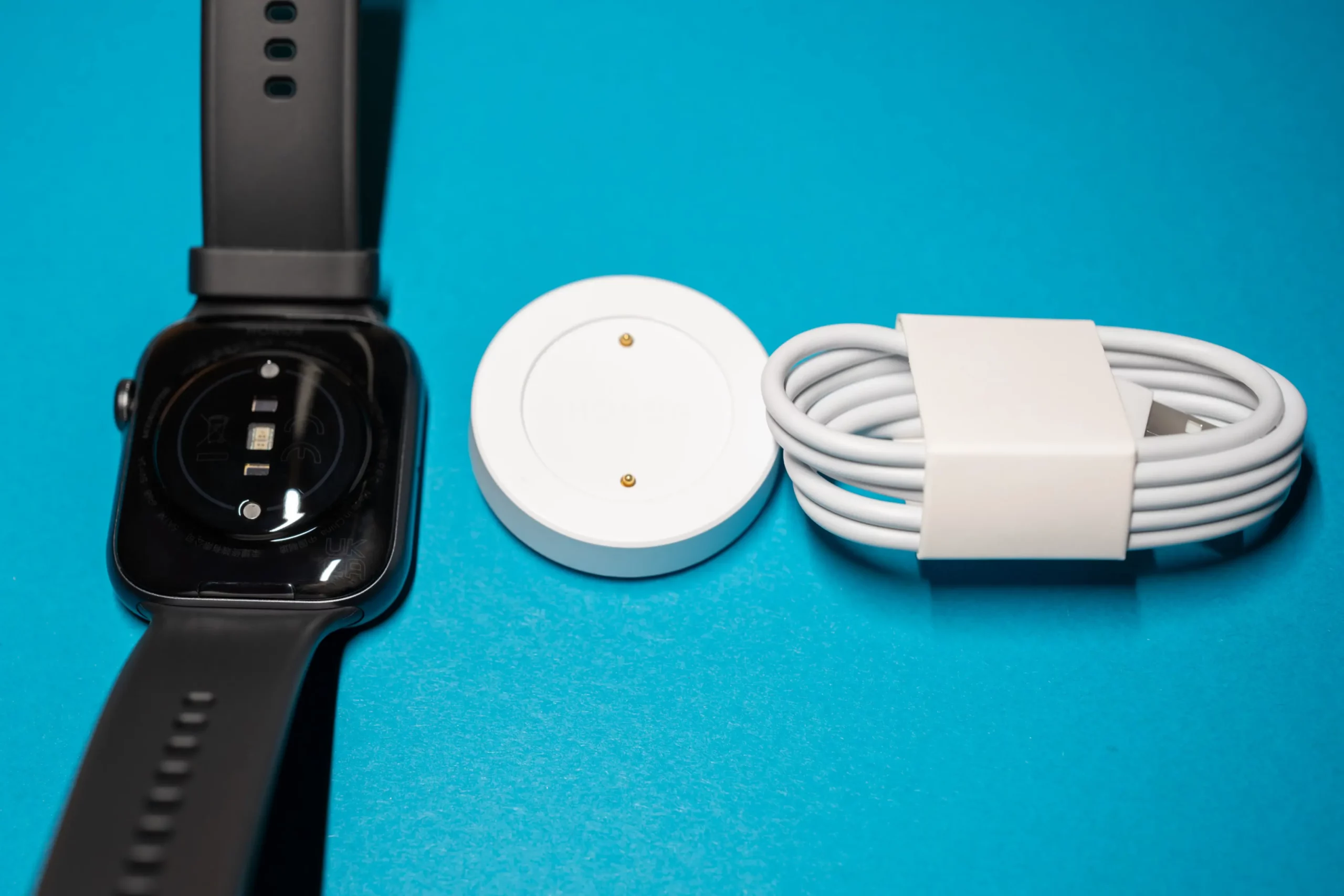 На нижней стороне корпуса находятся датчики и контактные площадки для зарядки. Смарт-часы заряжаются при помощи идущего в комплекте магнитного зарядного устройства с разъемом USB-A.