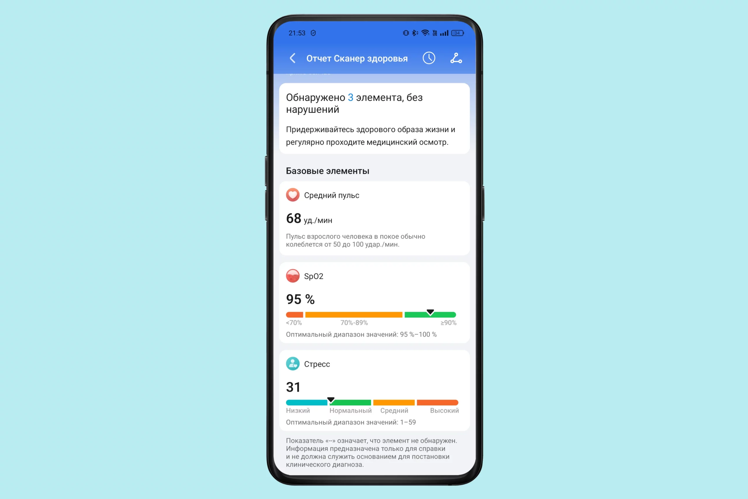 Большинство других функций так или иначе связаны с активным образом жизни и мониторингом здоровья. Часы получили функцию проверки ключевых параметров здоровья одним нажатием кнопки. В единое исследование были собраны: измерение пульса, уровня стресса, насыщения крови кислородом, результат последнего измерения параметров сна. Весьма удобное интерфейсное решение, позволяющее за 45 секунд получить некое общее представление о физическом состоянии пользователя. Естественно, каждый из параметров можно проанализировать отдельно или даже включить постоянный мониторинг в приложении «HONOR Здоровье».
