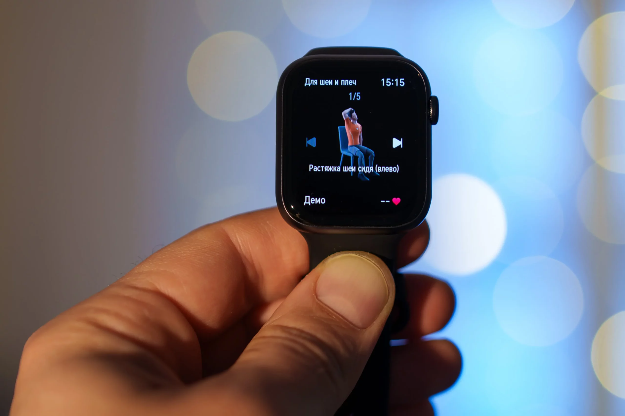 В смарт-часах реализованы курсы бега и пошаговые тренировки для тех, кто не готов составить себе план самостоятельно: от самых простых активностей к более сложным, уровень за уровнем. Например, разминка для шеи и плеч первого уровня. Все, что нужно сделать, умные часы покажут на экране, засекут время выполнения упражнения. Жаль лишь, что команды голосом они произносят только на английском языке.