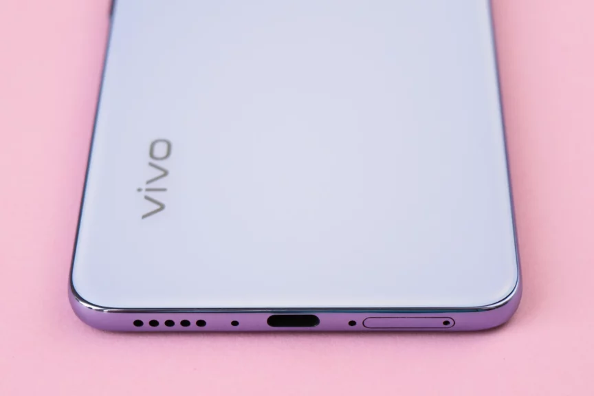 Боковая рамка стилизована под металл, но она пластиковая — обычное дело для нефлагманских моделей. Снизу находятся слот для двух SIM-карт, порт Type-C, динамик и микрофон. Слота для карты памяти microSD у vivo V50 нет.