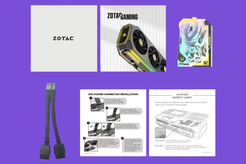 В простое карта потребляет от 12 до 20 Вт, под нагрузкой — до 250 Вт, в играх чаще 220−230 Вт. Питание подается по стандартному уже порту 16 pin (12VHPWR). В комплекте идет переходник с двух 8-Pin коннекторов. Обновлять БП необязательно. Сам 12VHPWR уже стал синонимом перегрева, но ZOTAC добавили сенсор, который покажет проблемы подключения. В случае перебоев он будет гореть красным, а стабильное соединение покажет зеленым цветом.