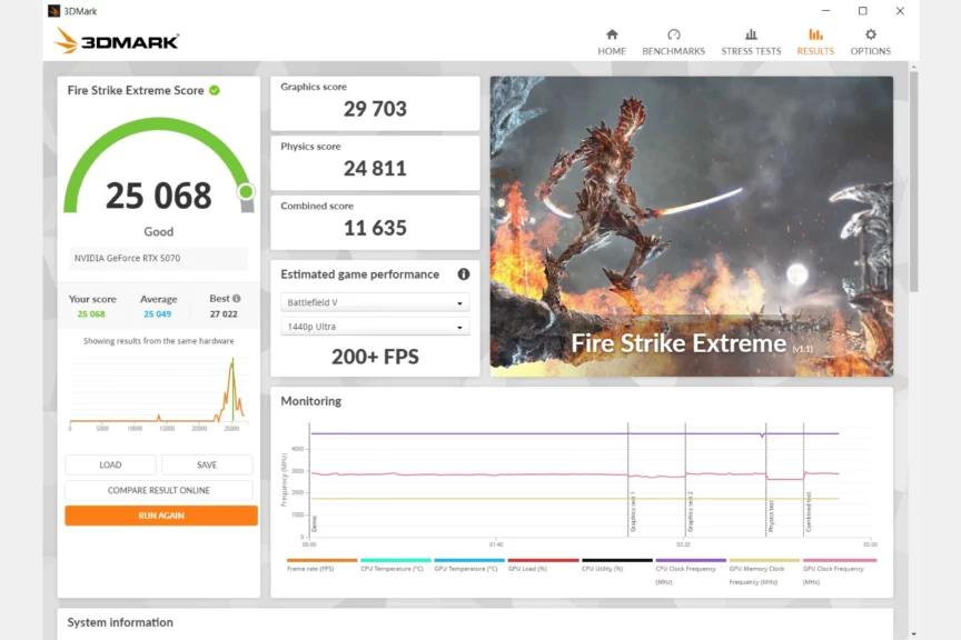 Радует, что и с двумя вентиляторами у Zotac получилась карта на уровне или выше средних показателей в 3DMark. Даже самые сложные сцены с трассировкой работают плавно.
