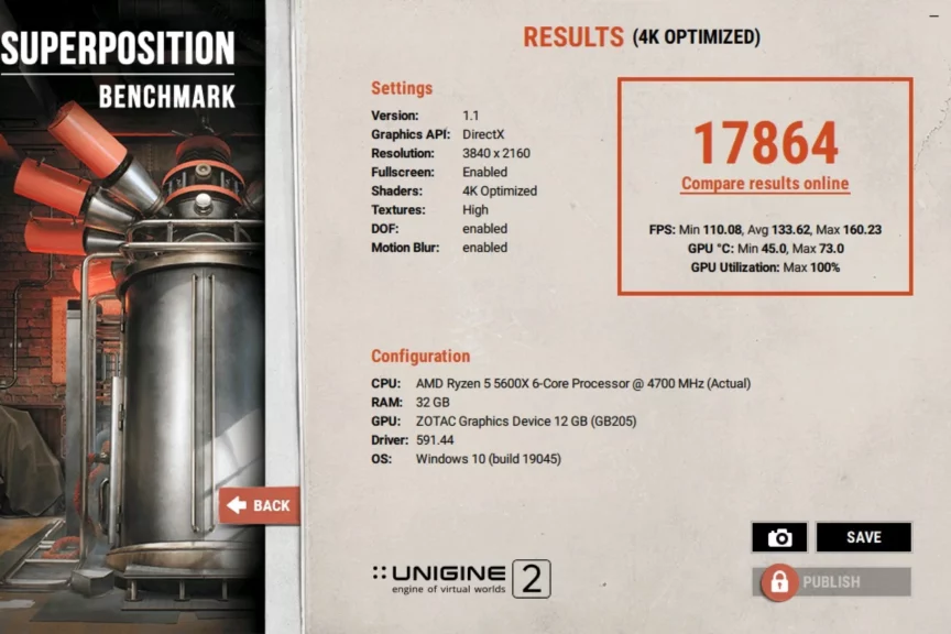 Тест от отечественных разработчиков использует не чистую трассировку, а довольно интересные гибридные техники. Получаем более 13 000 в 1080p Extreme и 17 864 в 4K Optimized.