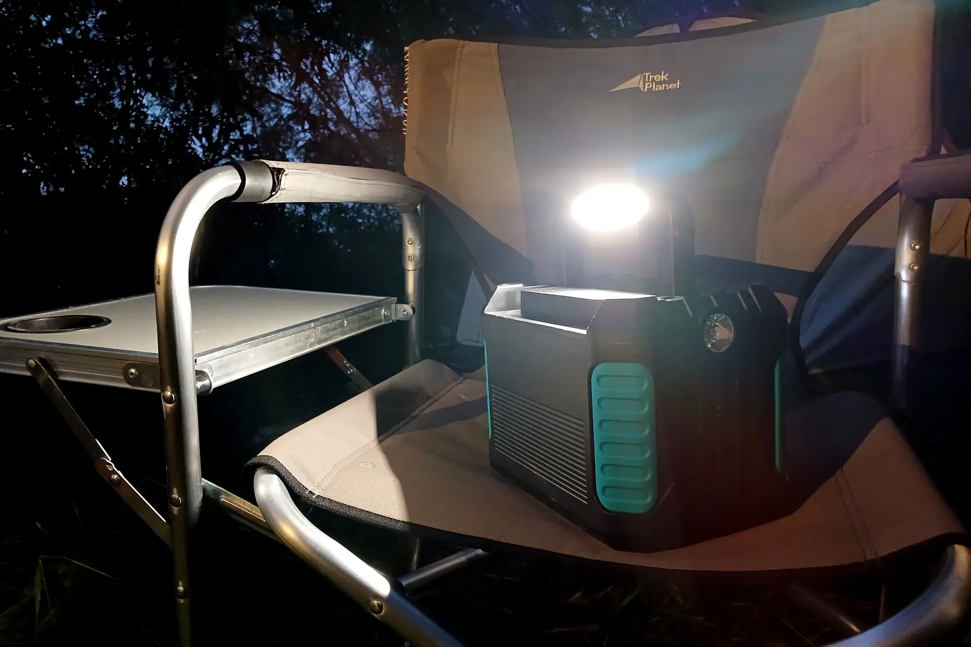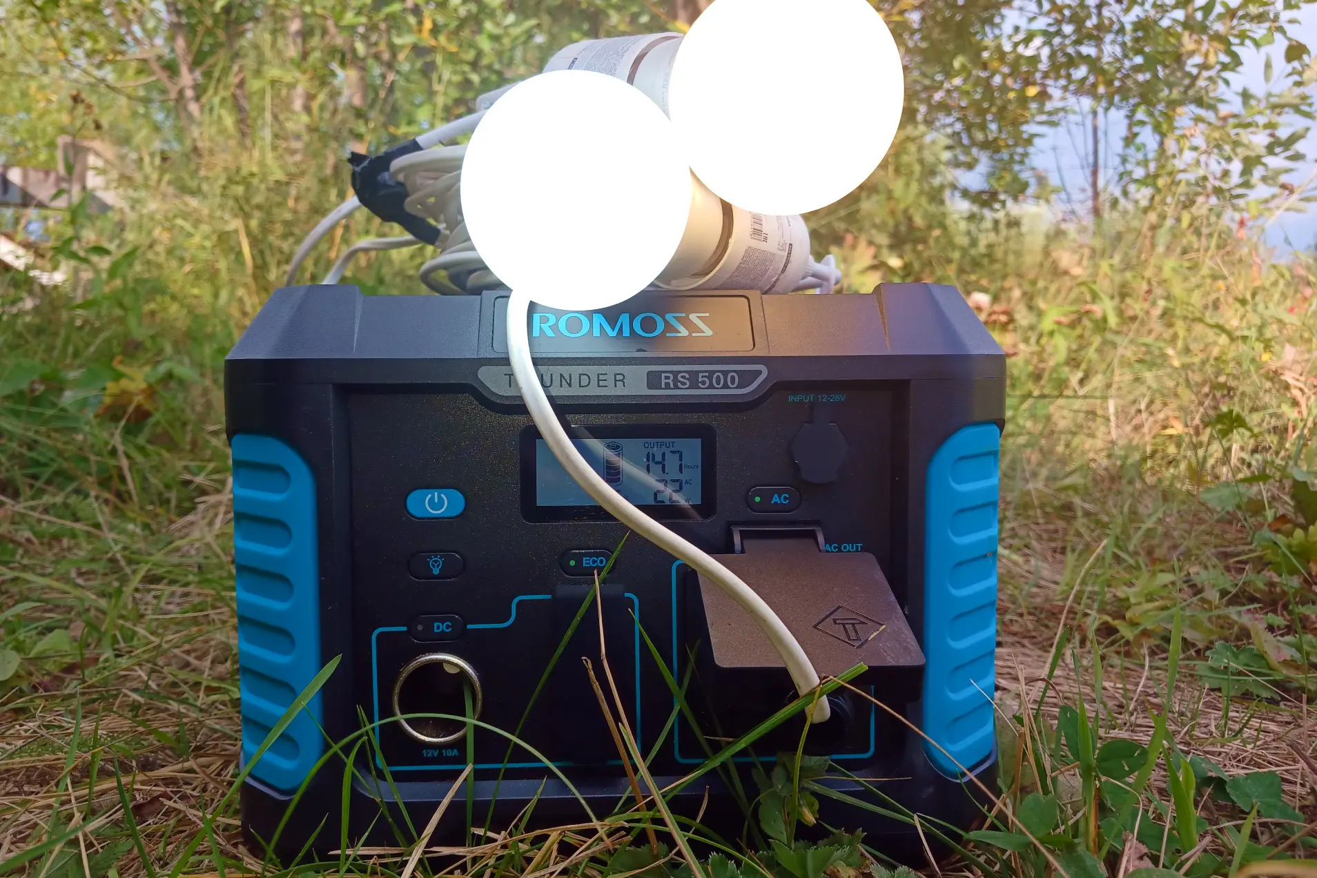 Наша «переноска» с двумя лампочками общей мощностью 22 Вт может освещать лагерь (по информации на дисплее электростанции) на протяжении 17 часов. Реальные цифры сходятся. За 4 часа полуночных посиделок аккумулятор «просел» всего на 20%. Кстати, Romoss Thunder RS500 может и сам быть источником света. У него 2 фонарика: один сбоку на корпусе, второй — в ручке для переноски. Оба по 1 Вт, вот только включить их одновременно не получится.