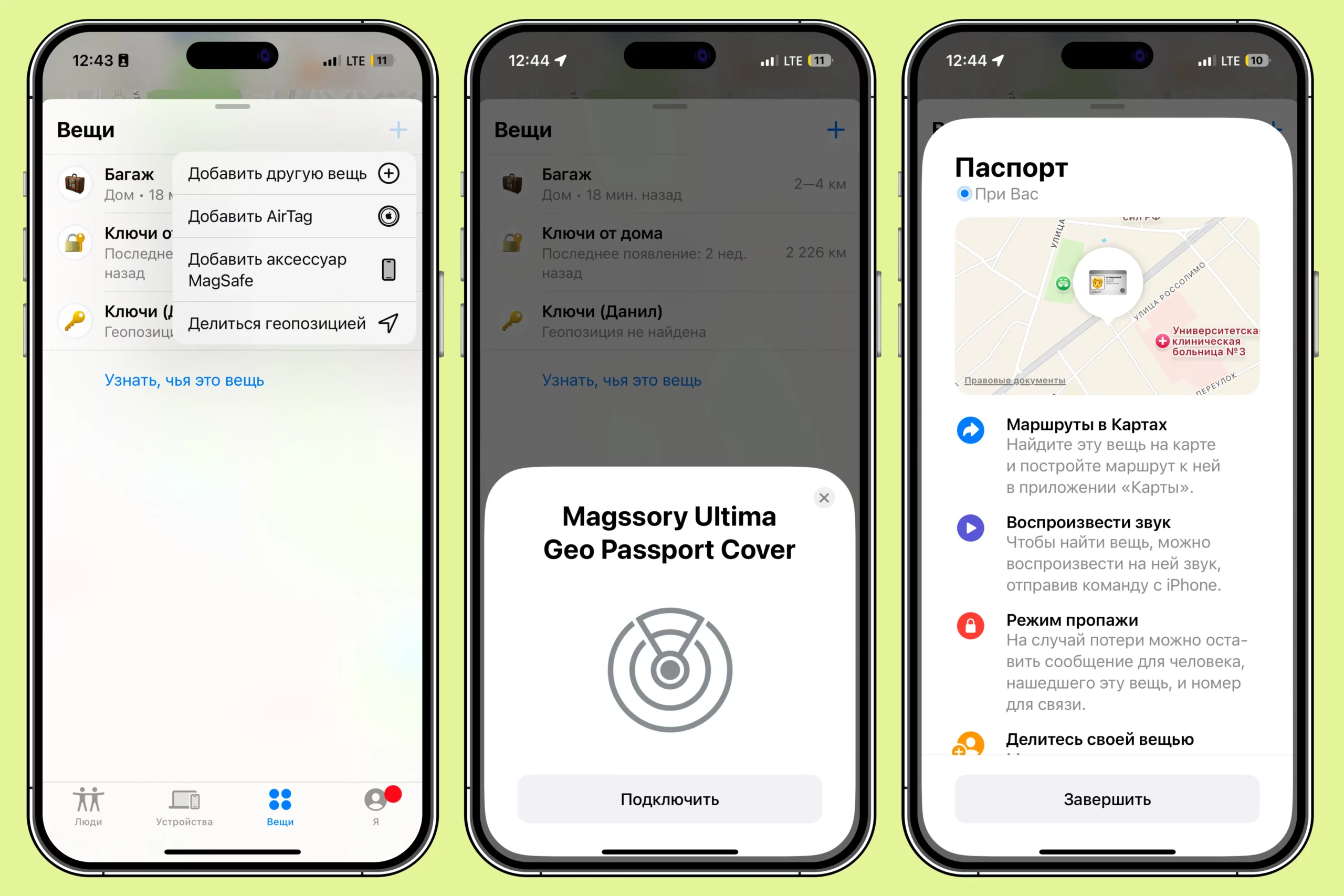 Багажная бирка с геолокацией — та же геометка, только в другом форм-факторе. Как и трекер, ее можно добавить в приложение «Локатор» и отслеживать через экосистему iPhone. Я прикрепил бирку к чемодану и поехал в аэропорт (аксессуары на тест мне прислали накануне отпуска). От момента регистрации на рейс до выдачи багажа в зоне прилета я не переживал, что мой саквояж потеряется или улетит в неизвестном направлении. Роскошь для тревожного человека.