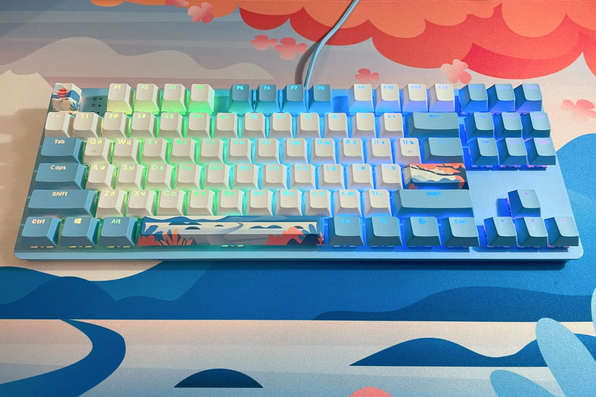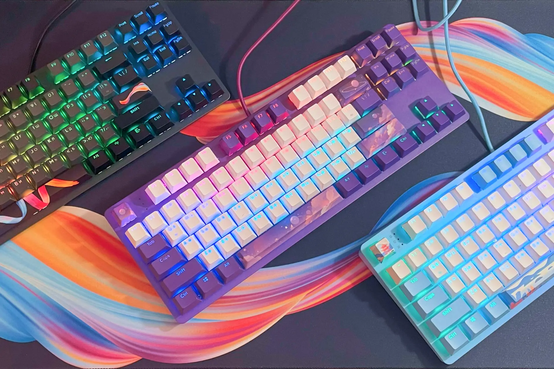 Сегодня речь идет сразу о трех моделях из серии Red Square Keyrox TKL: Hanami, Hyperion и Fireworks. Несмотря на звучные названия, отличаются они только дизайном — в остальном это идентичные устройства. Первые два имеют ярко выраженный акцентный цвет (синий и фиолетовый соответственно), а также выделяющуюся графику. Каждая модель получила свою картинку: абстрактные ленты, нежные облака или азиатская тематика. Возможно, не всем любителям классики придутся по душе рисунки на Shift, Backspace, Enter и Space, однако в комплекте идут съемные кейкапы со стандартными надписями. Тогда от дизайна останется только сочетание белого цвета основного блока клавиш с цветным акцентом по бокам.