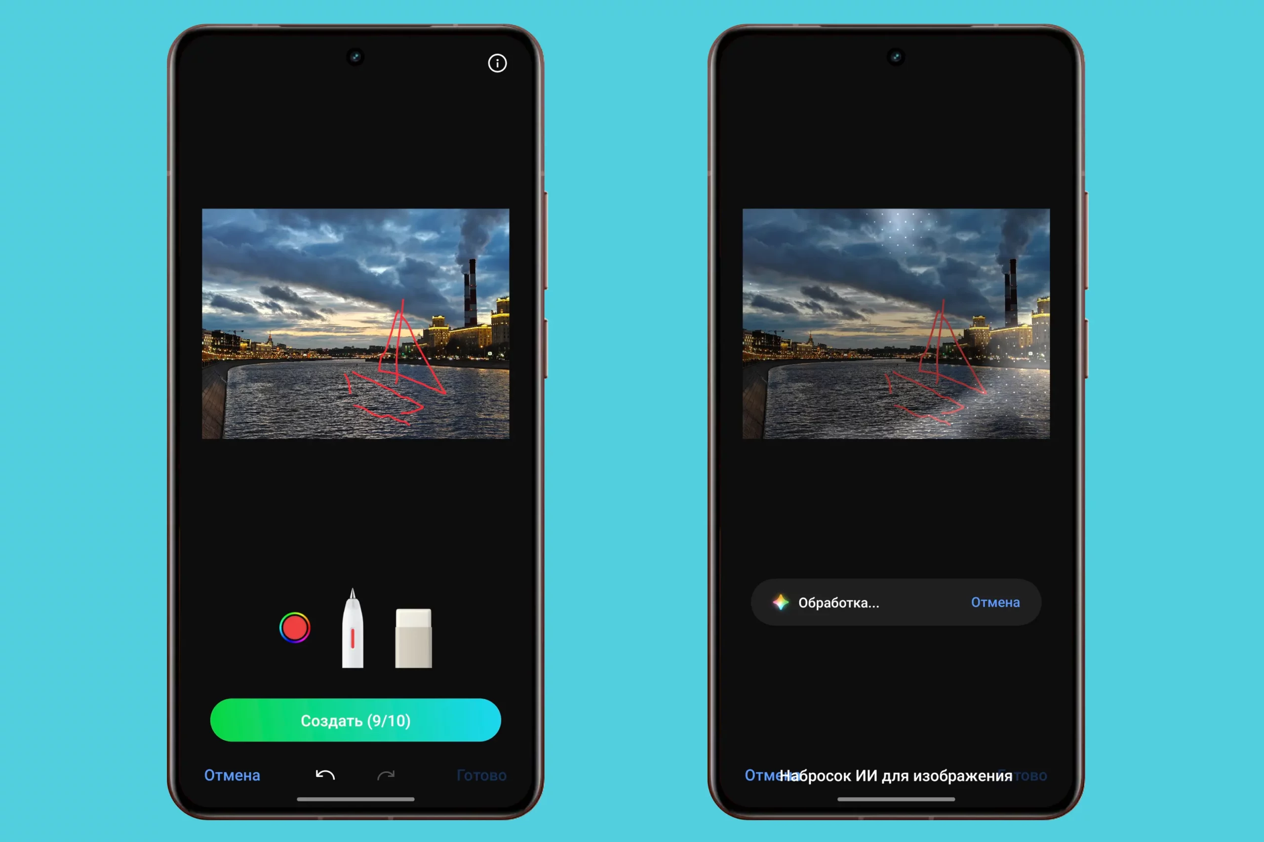 Во время обработки фото можно применять достижения искусственного интеллекта. Например, смартфон умеет сам убирать людей с фотографий, повышать резкость смазанных объектов и даже генерировать объекты по рисунку на экране.
