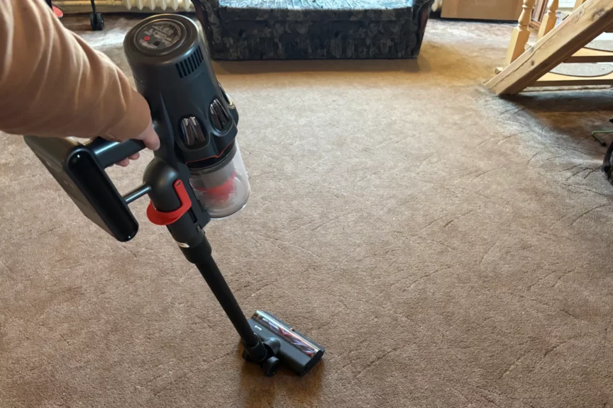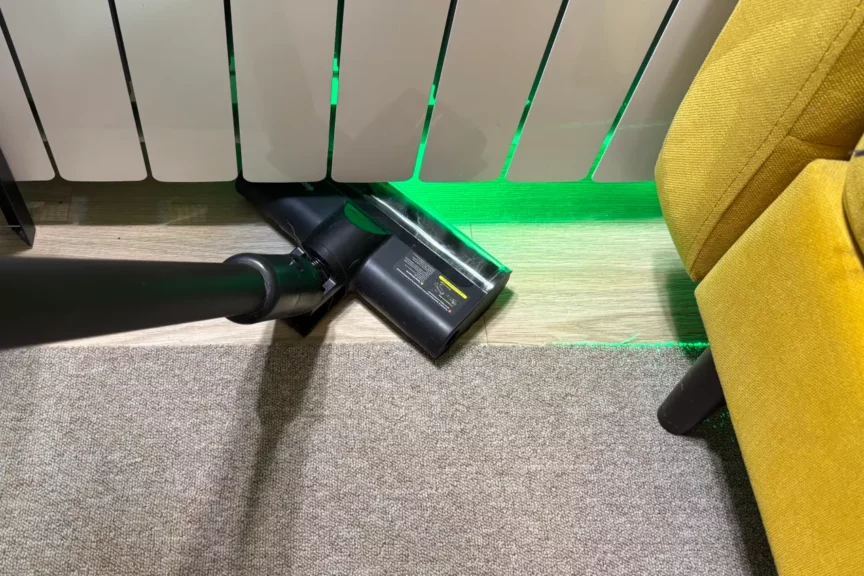 Тест-драйв проходил в загородном доме, где в главной комнате лежит большой ковер с высоким ворсом. Пылесос работал в режиме «Турбо»: успел пройтись два раза, пока не сел аккумулятор. Пыли и шерсти было очень много, хотя ковер чистим каждую неделю обычным проводным пылесосом. Секрет в крутящемся ролике Deerma DEM-T50W. С ним уборка получается качественнее.